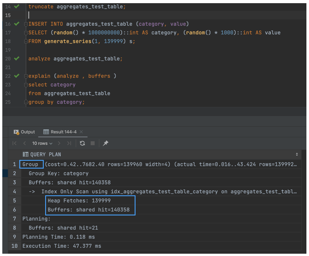 그렇기 때문에 GroupAggregate는 이미 정렬된 데이터셋이나 적절한 인덱스가 있는 경우에 선택될 때 가장 효과적으로 동작한다.