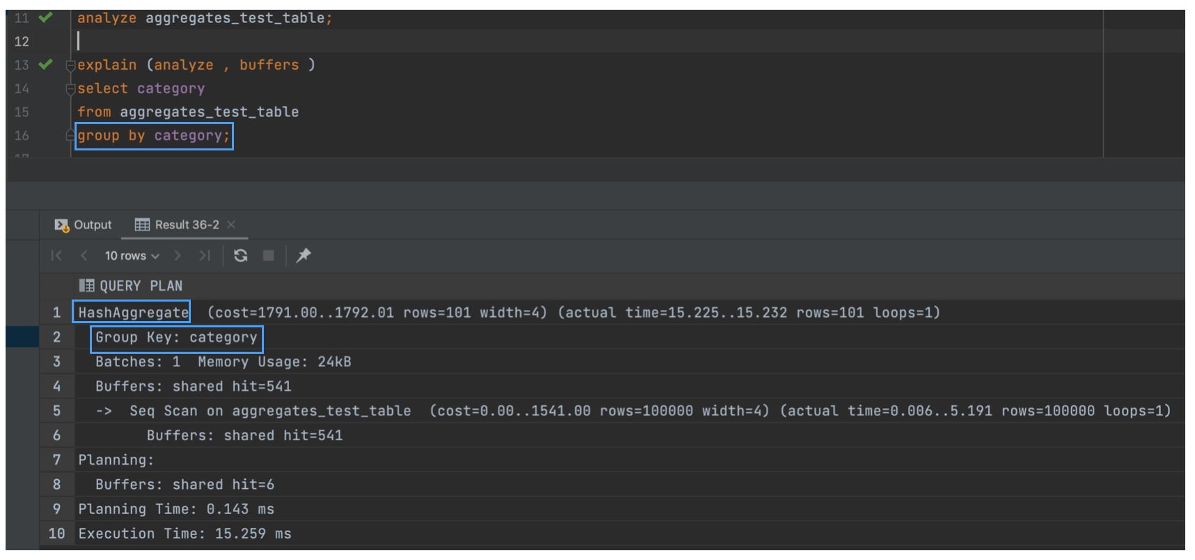 위 실행계획을 보면 HashAggregate가 선택되었고, category 칼럼을 Group Key로 사용한 것을 확인할 수 있다.