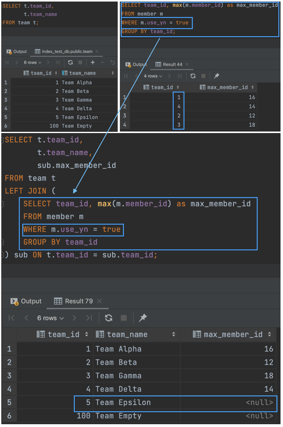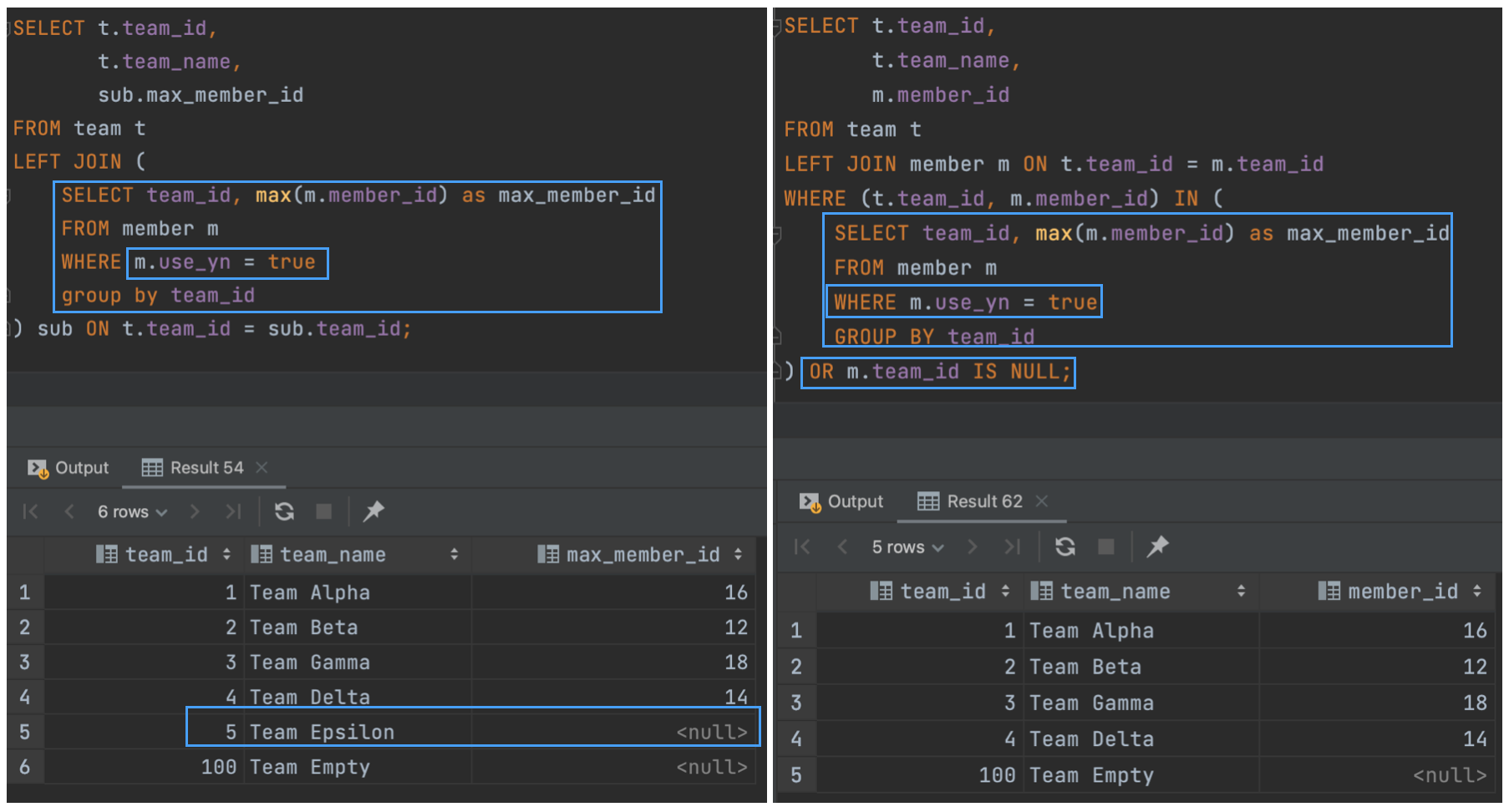 위 결과를 보면, Where절의 서브쿼리에서는 team_id(100)인 team 데이터가 빠져있다. Where절에서 IN으로 필터링했기 때문에 당연하게도 서브쿼리에 포함되어있지 않은 데이터는 사라지게 된다.