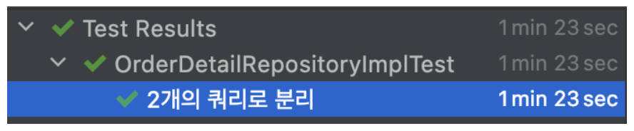 - 2개의 쿼리로 분리한 경우 1분 23초가 걸렸다.