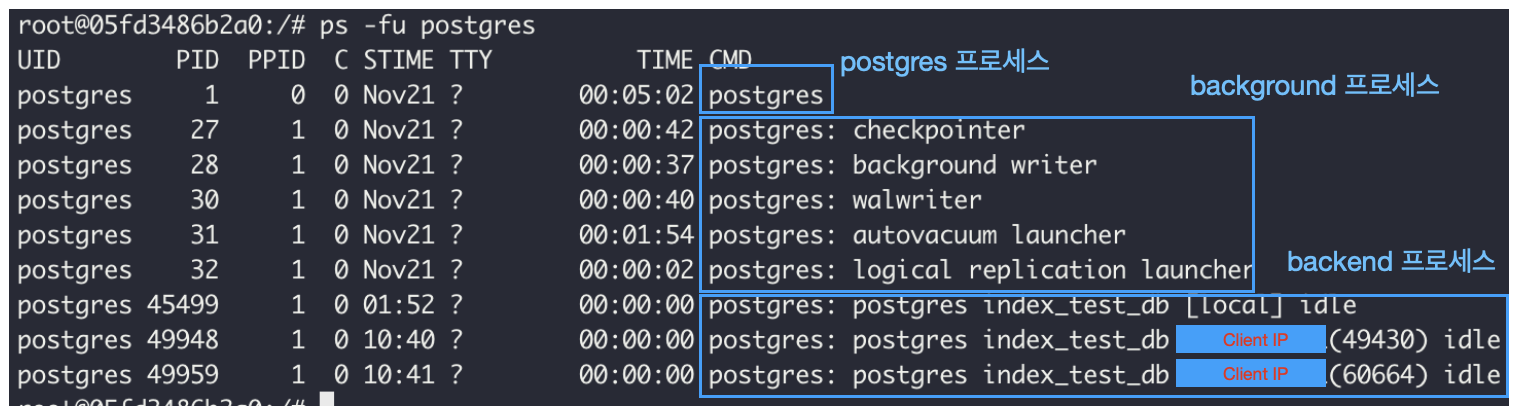- Backend 프로세스는 자신에게 배정된 커넥션을 통해 요청된 쿼리 또는 명령을 수행하기 위한 일종의 워커 프로세스다.