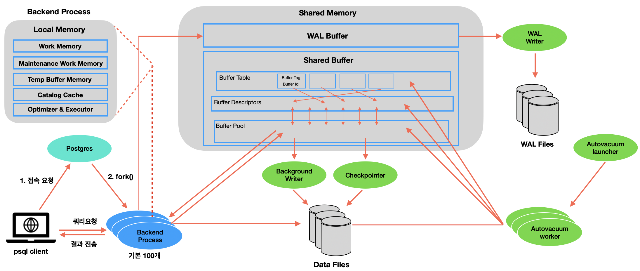 - Backend 프로세스는 Client가 요청하는 쿼리를 수행하며, 작업 수행을 위한 로컬 메모리 영역이 존재한다.