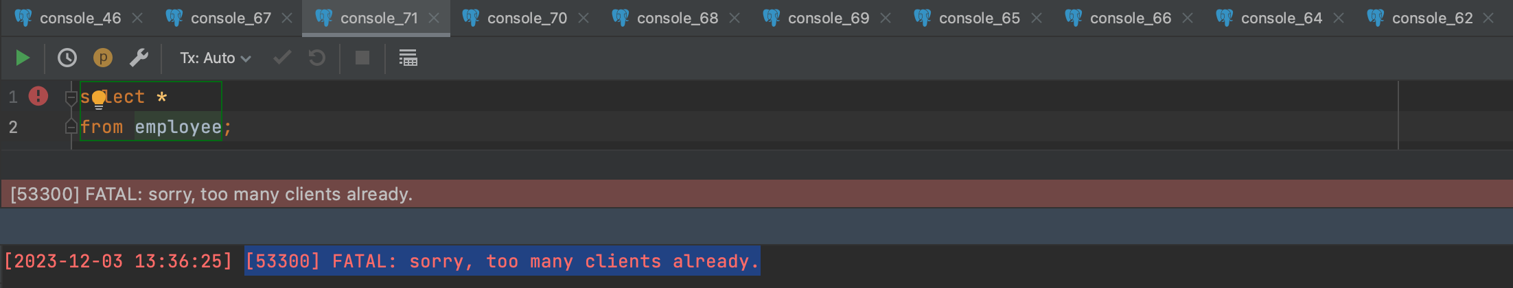 backend_type이 client backend이기 때문에 위와 같이 현재 동작중인 백엔드 프로세스의 수를 확인할 수 있다. - 만약 max_connections값 보다 더 많은 백엔드 프로세스를 생성하려고 하면 아래와 같은 오류 메시지를 뱉는다.