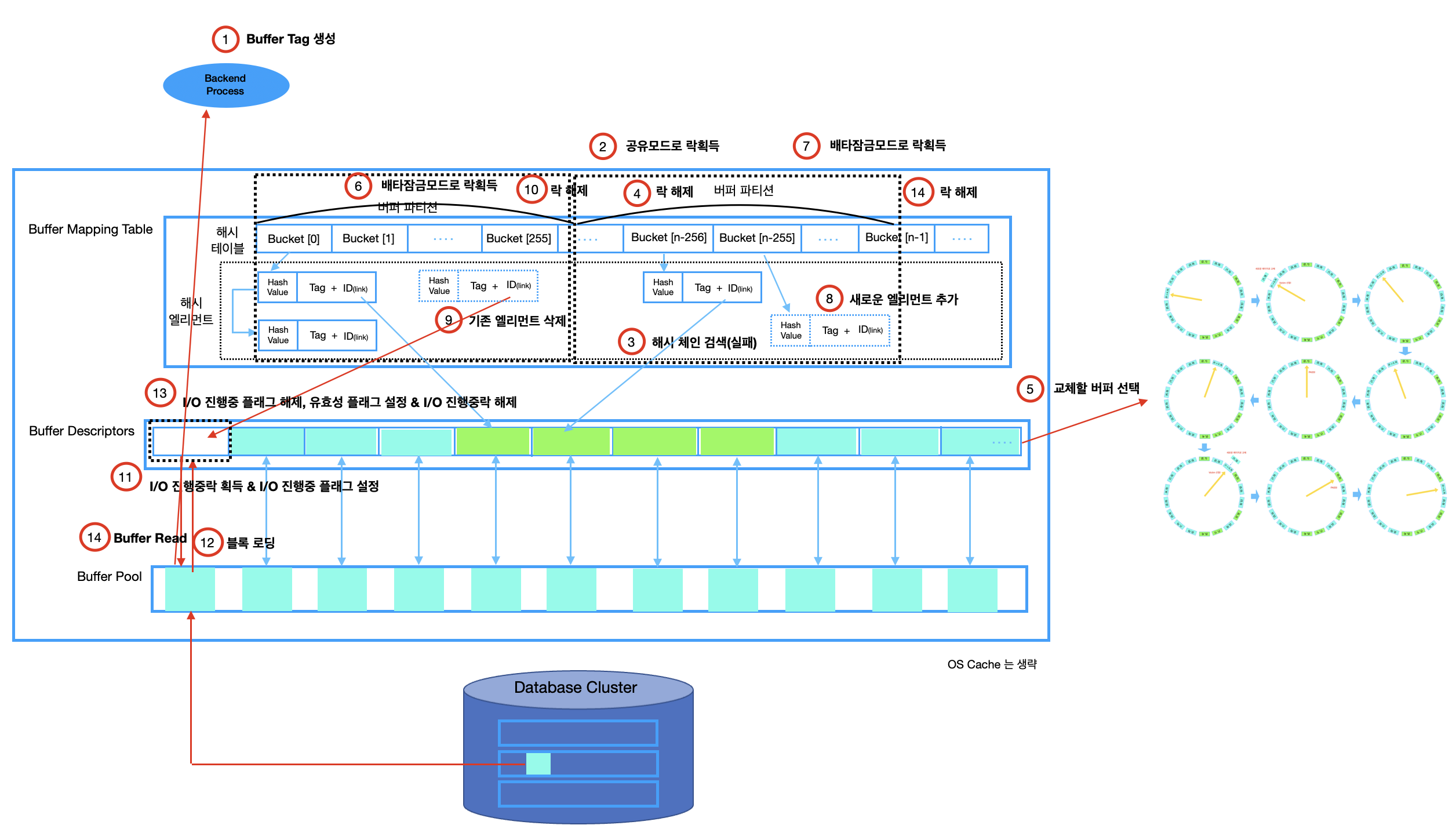 - 생성된 Buffer Tag로 찾은 버퍼파티션에 배타잠금모드로 락을 획득한다.