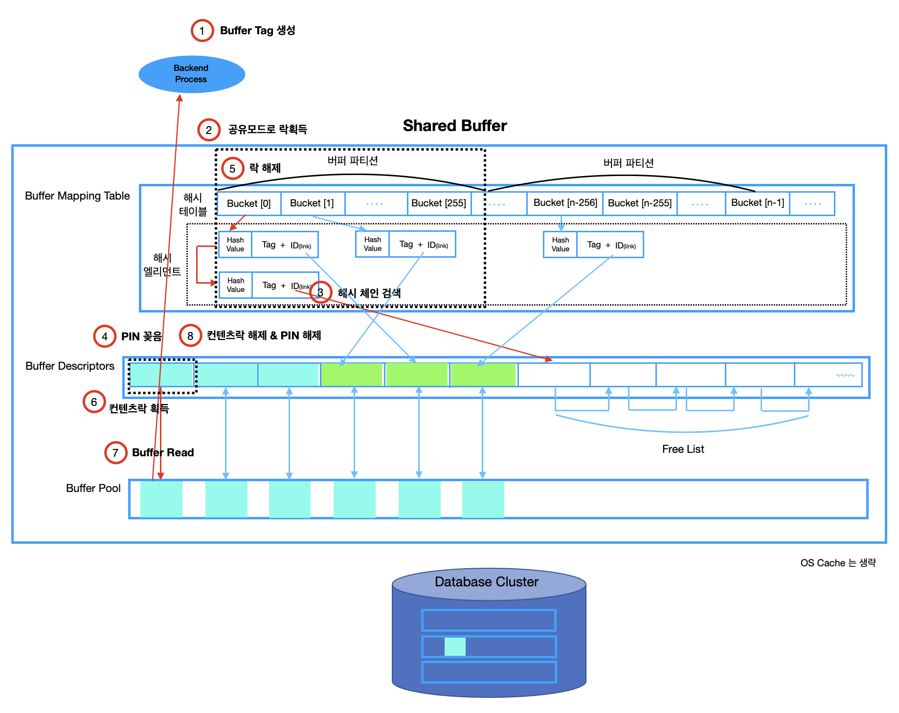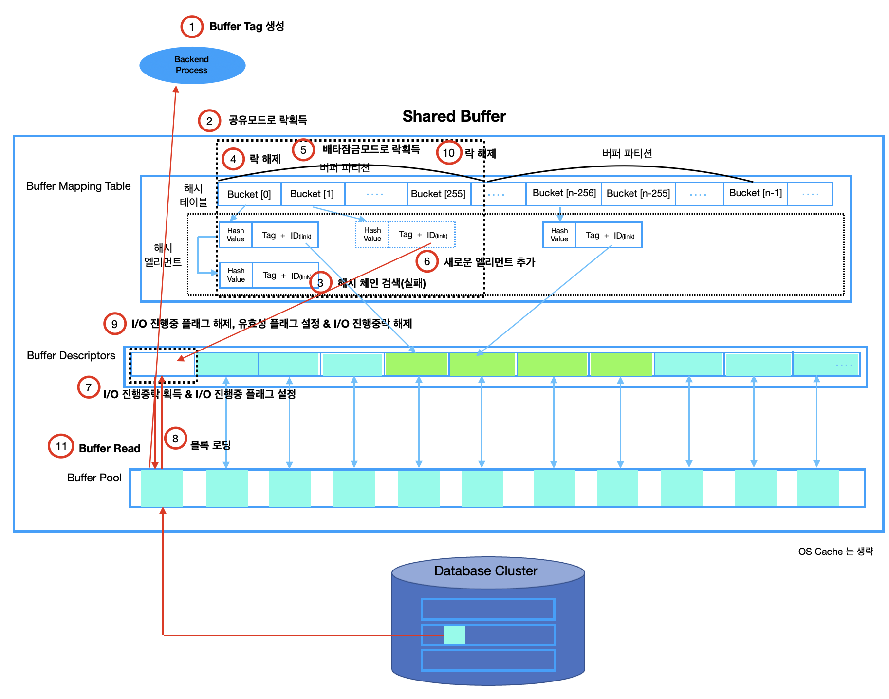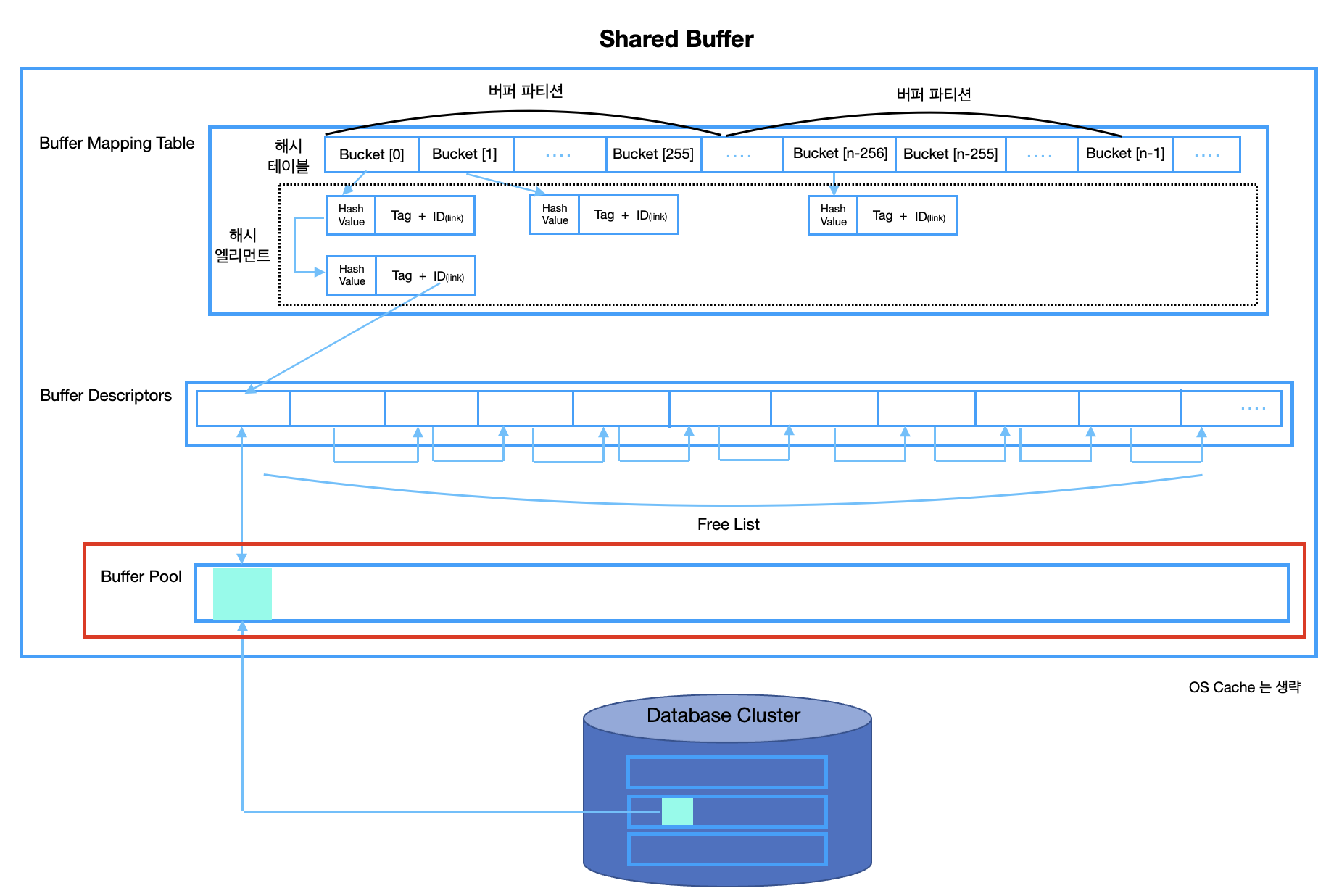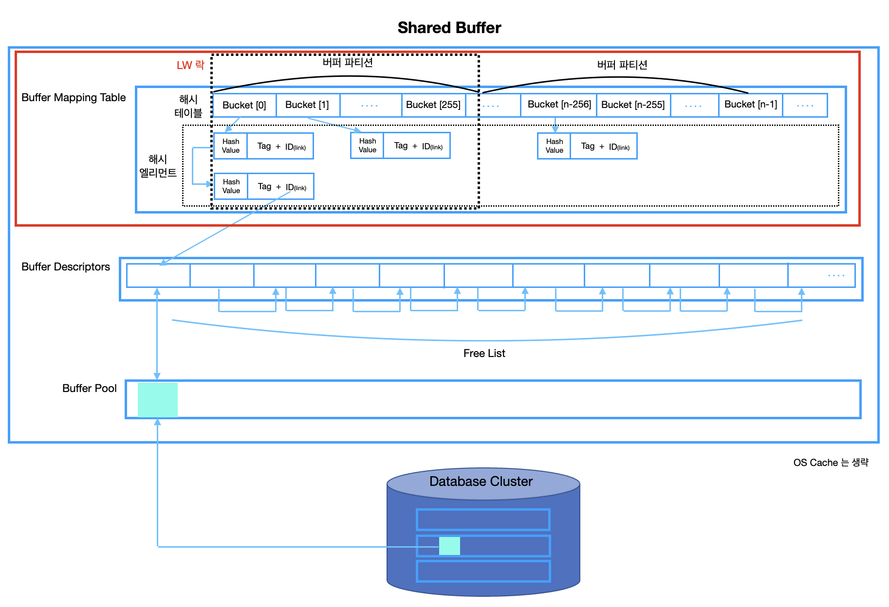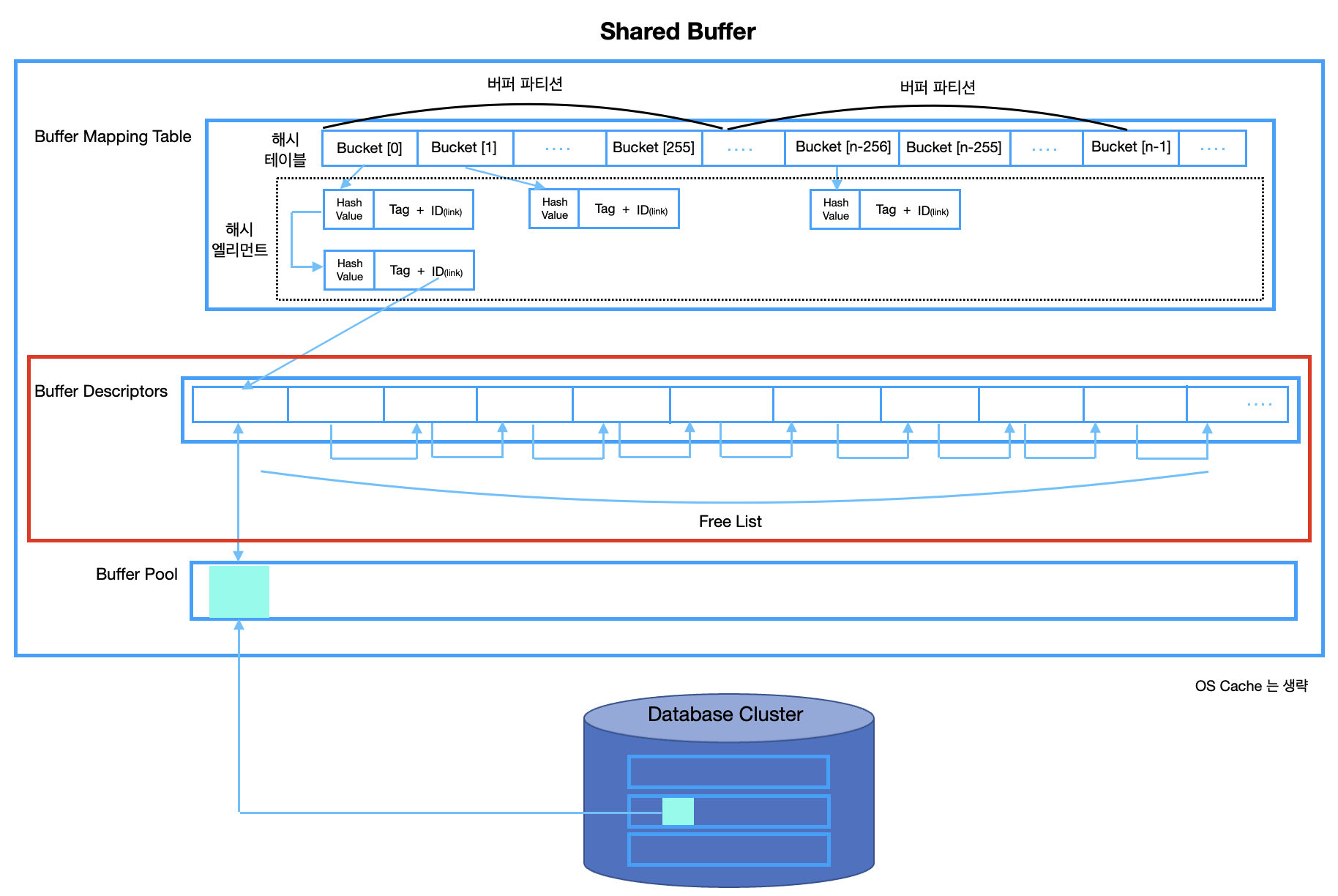 - Shared Buffer는 Buffer Mapping Table, Buffer Descriptors 그리고 Buffer Pool로 이루어져 있다.