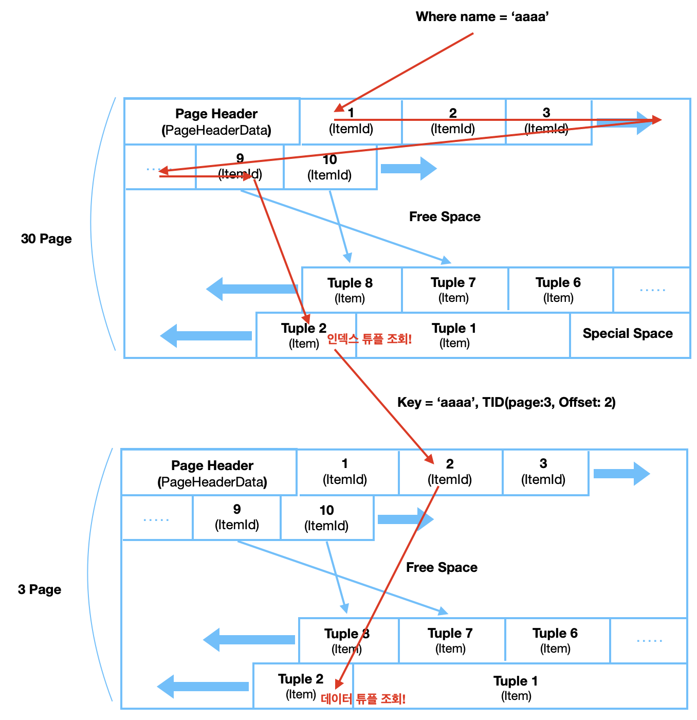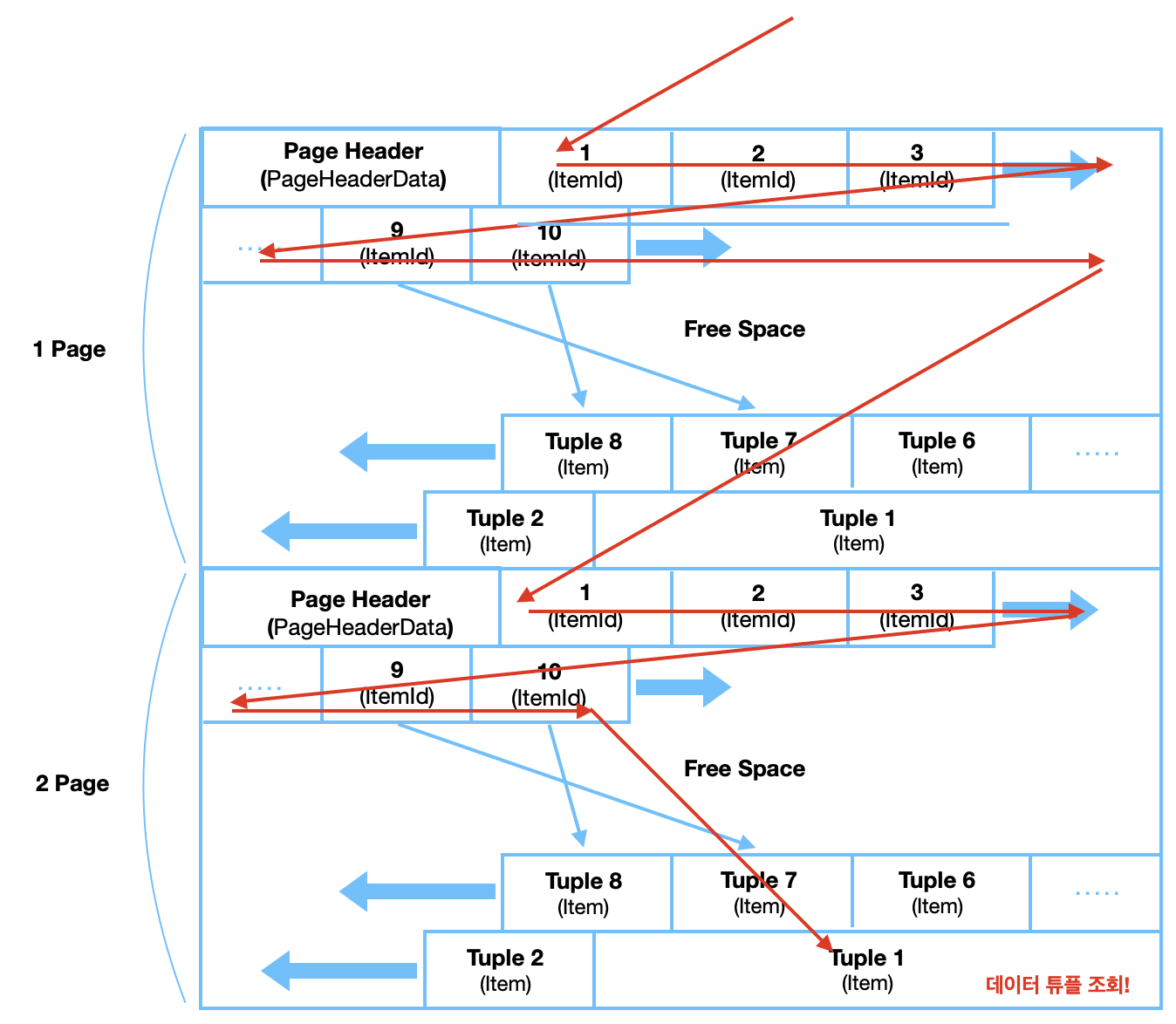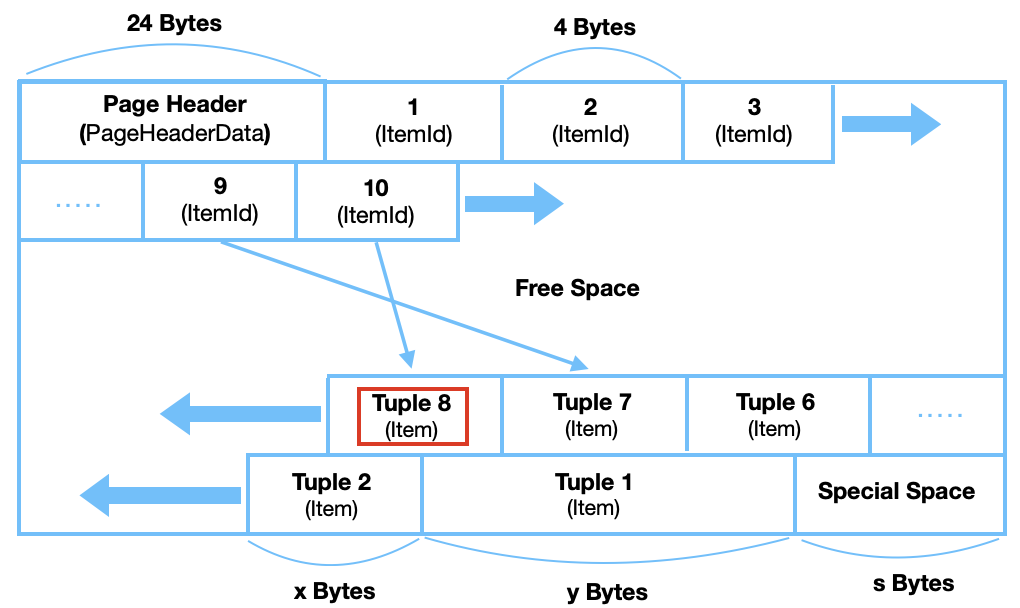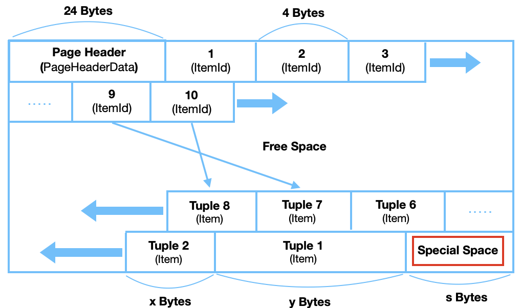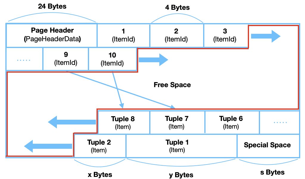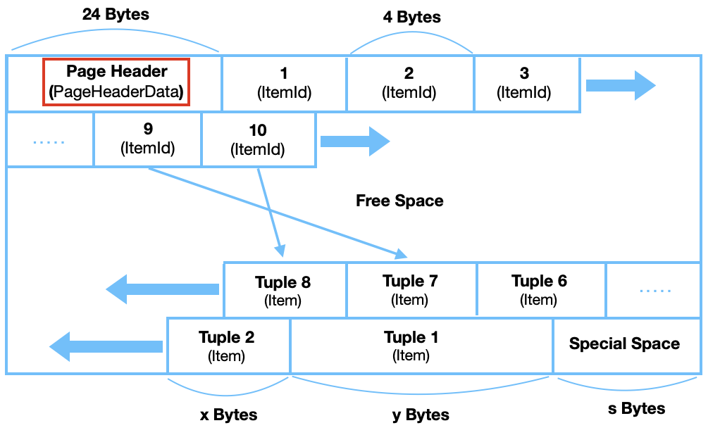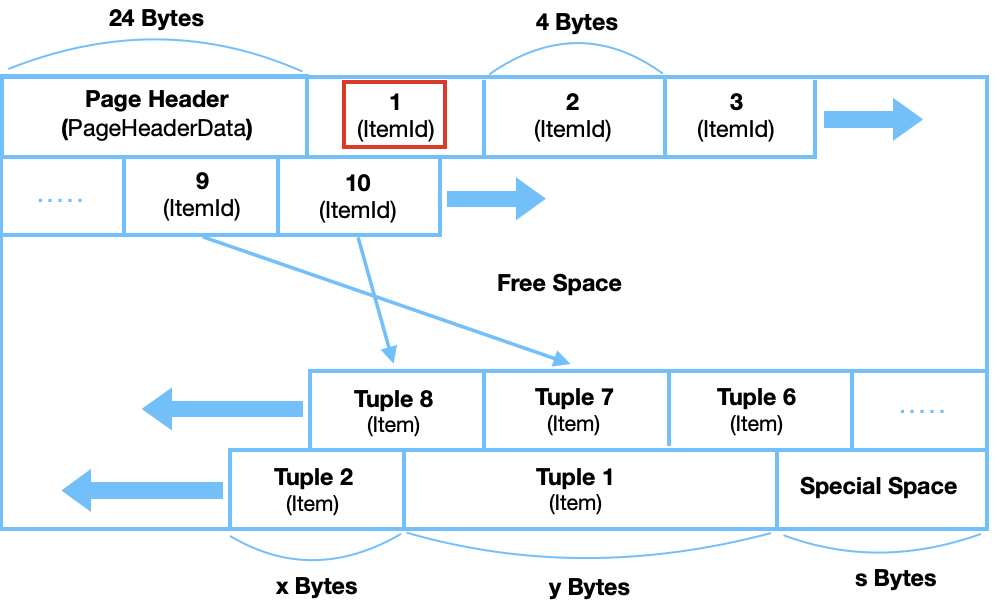 - 각 페이지는 PageHeaderData, ItemId, Free Space, Item, Special Space로 구성된다.