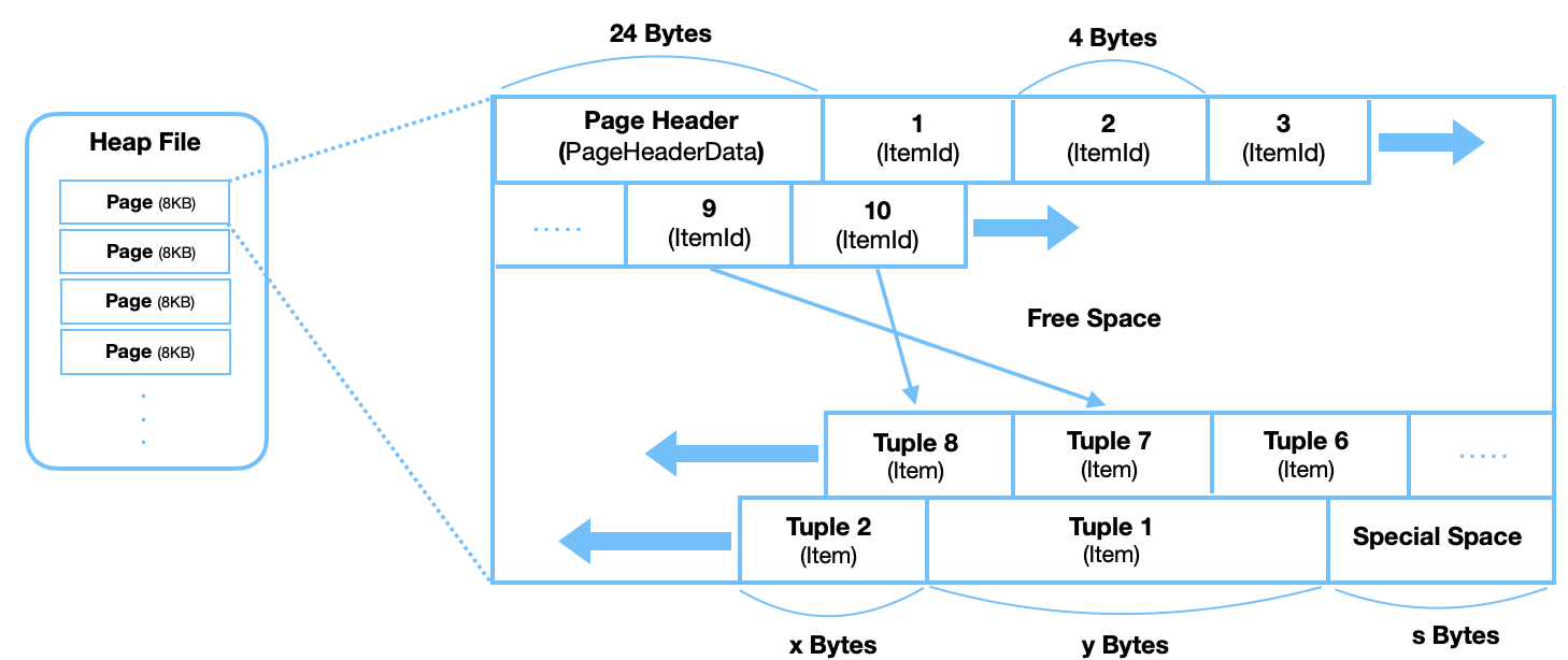 $PGDATA/base/{데이터베이스의 OID}/{테이블의 OID}라는 파일명으로 Heap File이 존재하며 Heap File안에는 8KB 크기의 페이지(블록)으로 구성되어 있다.