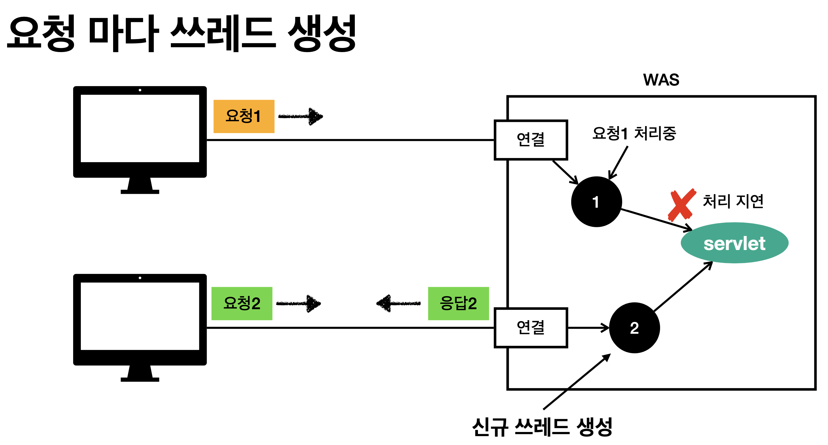 • 단일 쓰레드 환경에서 이미 쓰레드가 사용중이라면, 새로운 요청을 바로 처리할 수 없다.
