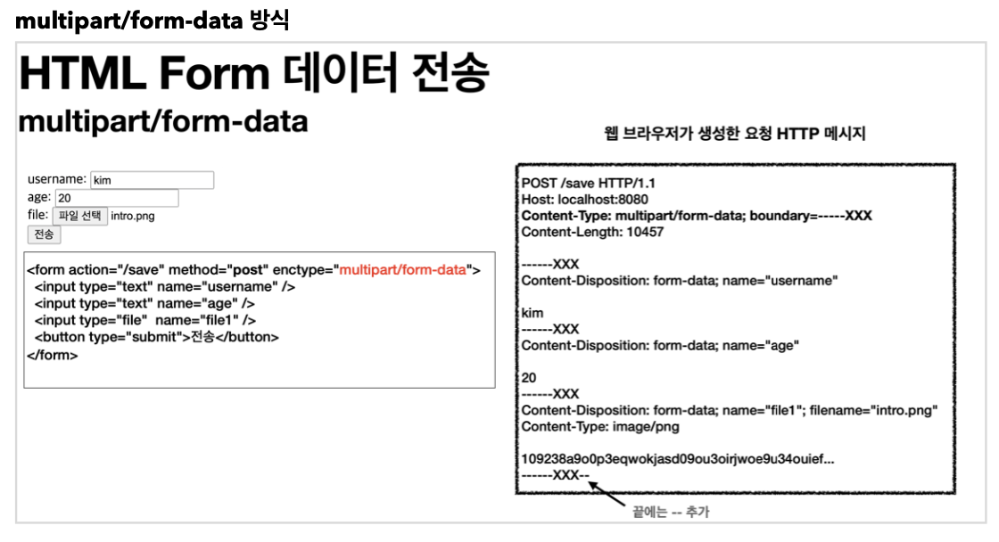 - 위와 같이 multipart/form-data 방식은 다른 종류의 여러 파일과 폼의 내용 함께 전송할 수 있다.