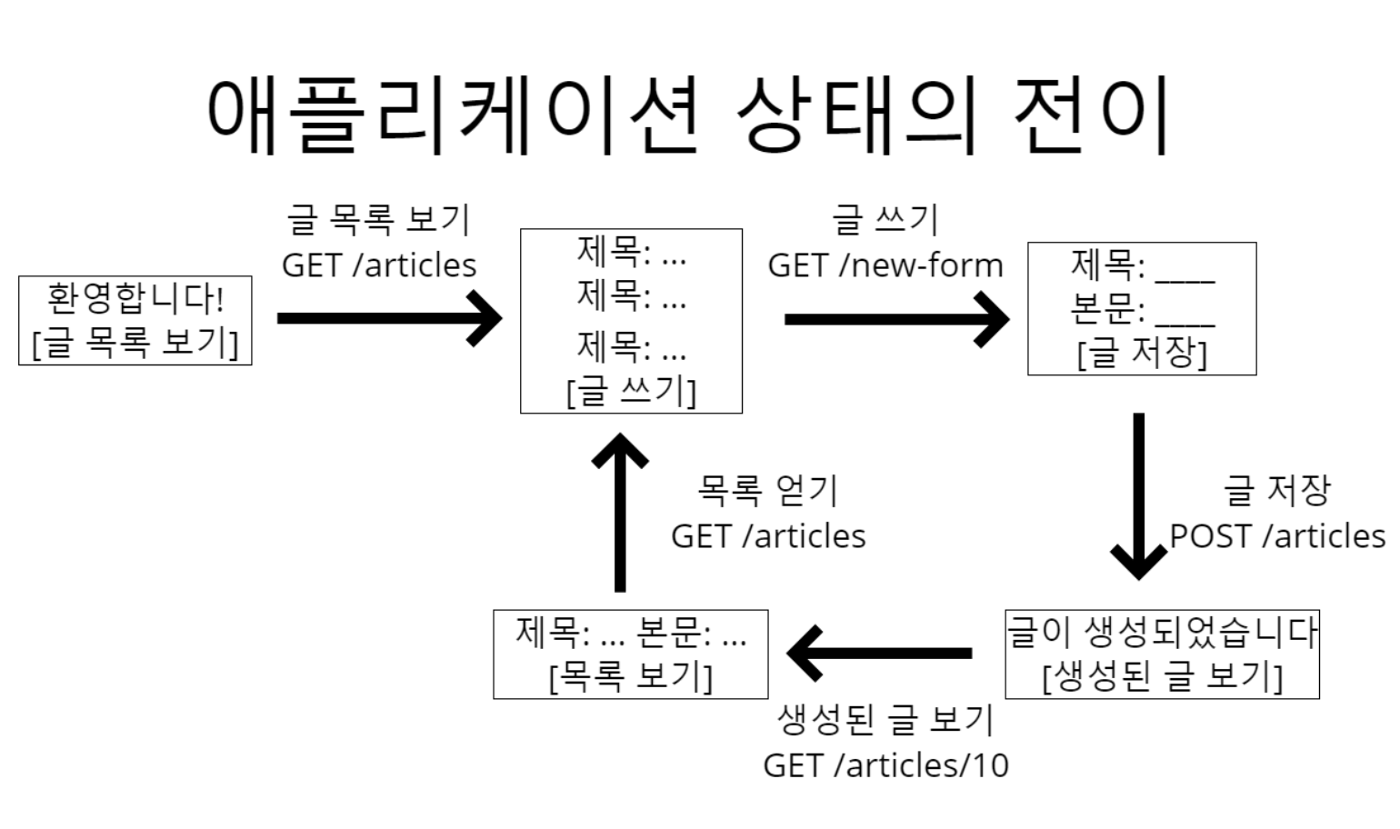 루트 홈페이지 → 글 목록 보기 GET → 글 쓰기 GET → 글 저장 POST → 생성된 글 보기 GET → 목록 보기 GET → - 이렇게 상태를 전이하는 것을 애플리케이션 상태 전이라고 하고, 이 상태 전이마다 항상 해당 페이지에 있던 링크를 따라가면서 전이했기 때문에 HATEOAS라고 할 수 있다.