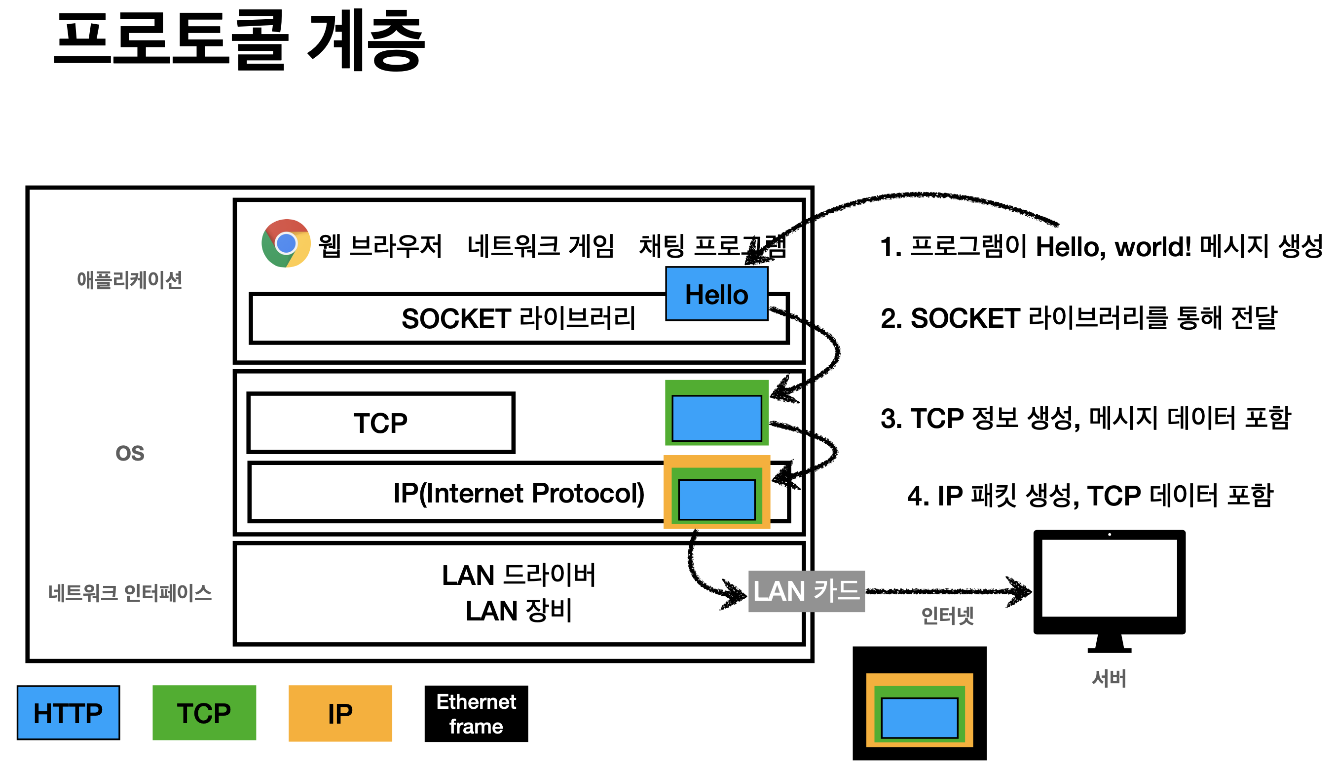 - 위와 같이 계층을 통과할때마다 정보를 한겹한겹 씌워서 다음 단계로 이동한다.
