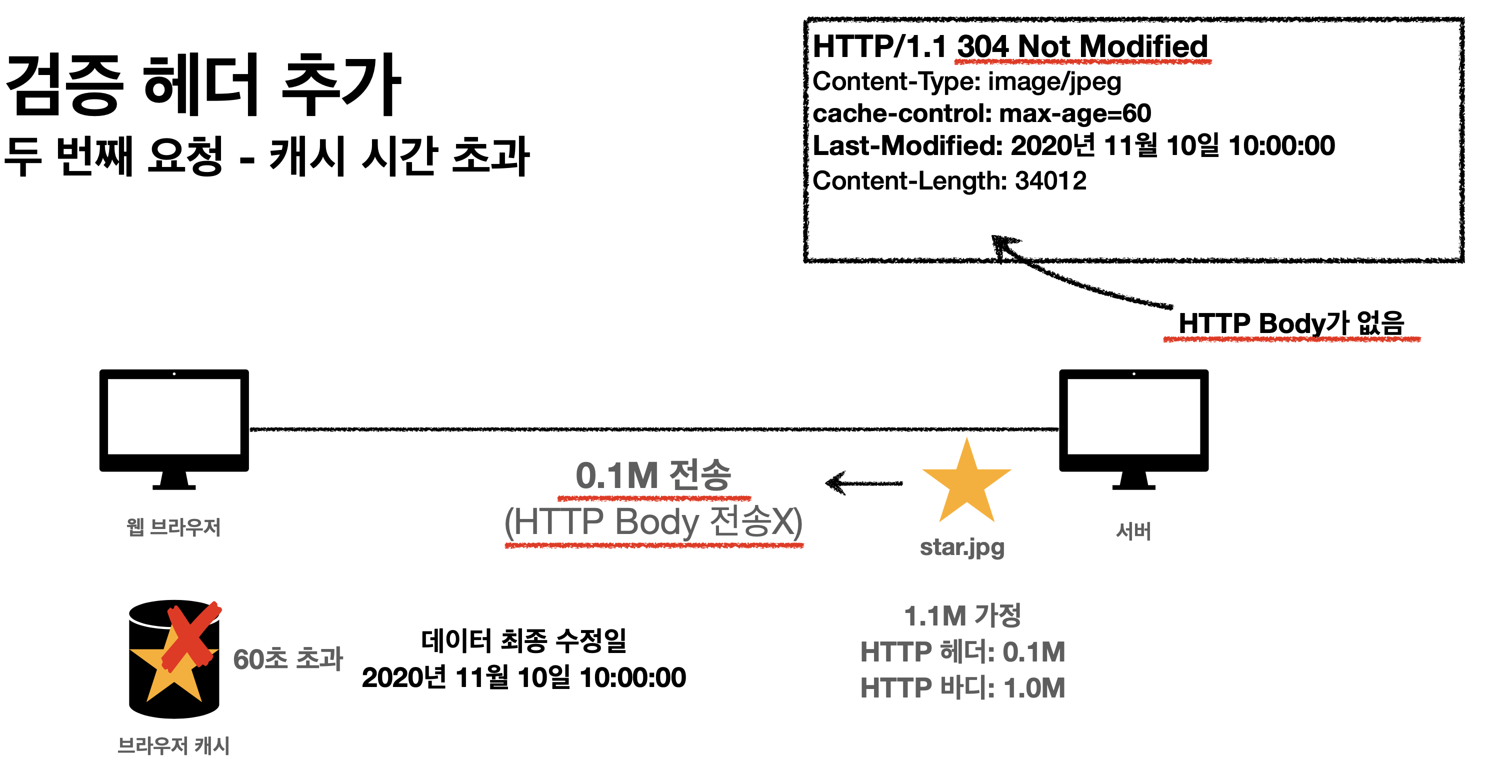 - 304 Not Modified + 헤더 메타 정보만 응답(바디X)