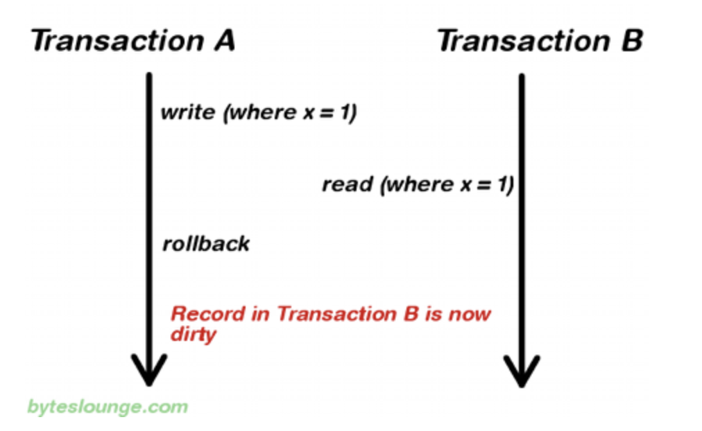 - 한 트랜잭션(Transaction A)이 데이터에 접근하여 값을 'x'에서 'y'로 변경했고 아직 커밋을 하지 않았을때, 다른 트랜잭션(Transaction B)이 해당 데이타를 Read 하면 문제가 발생할 수 있다.