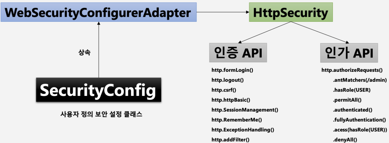 - WebSecurityConfigurerAdapter 를 상속받으면 Security 설정을 할 수 있다.