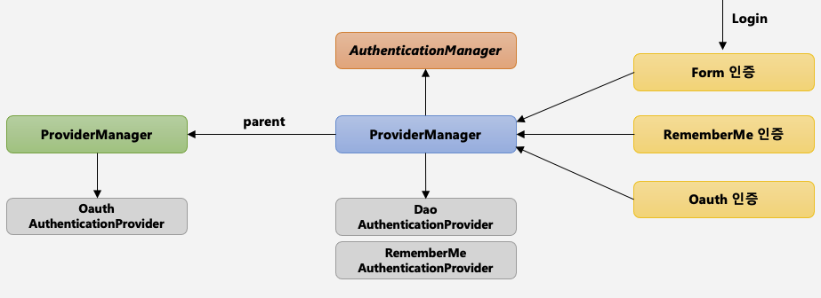 - 대부분 AuthenticationManager 인터페이스를 직접 구현한 ProviderManager 구현체 클래스를 사용한다.