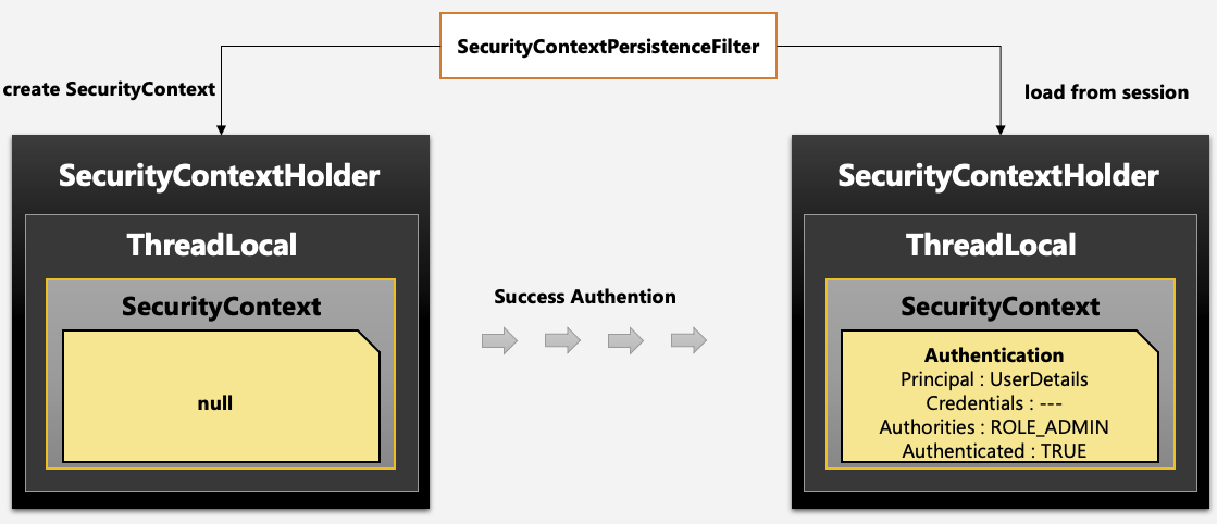 - 왼쪽의 SecurityContextHolder 가 인증전이고 오른쪽의 SecurityContextHolder 가 인증 후이다.