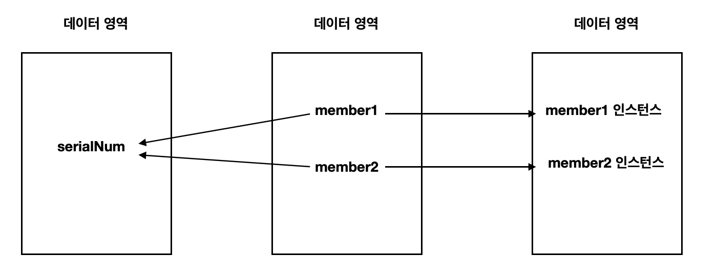 - 위와 같이 인스턴스들이 공통으로 가져야 할 serialNum은 static 변수로 선언해서 인스턴스들의 기준값으로 사용할 수 있다.