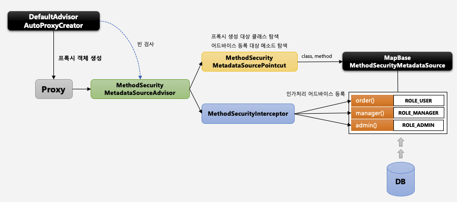 - 정보를 전달받은 MethodSecurityMetadataSource 는 class 정보와 method 정보를 파싱해서 보안 메소드가 설정된 빈일 경우 프록시 생성 대상으로 간주하고 DefaultAdvisorAutoProxyCreator 는 프록시 객체를 생성한다.