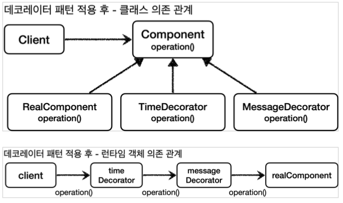 - 따라서 의존관계는 client -> timeDecorator -> messageDecorator -> realComponent 가 된다.