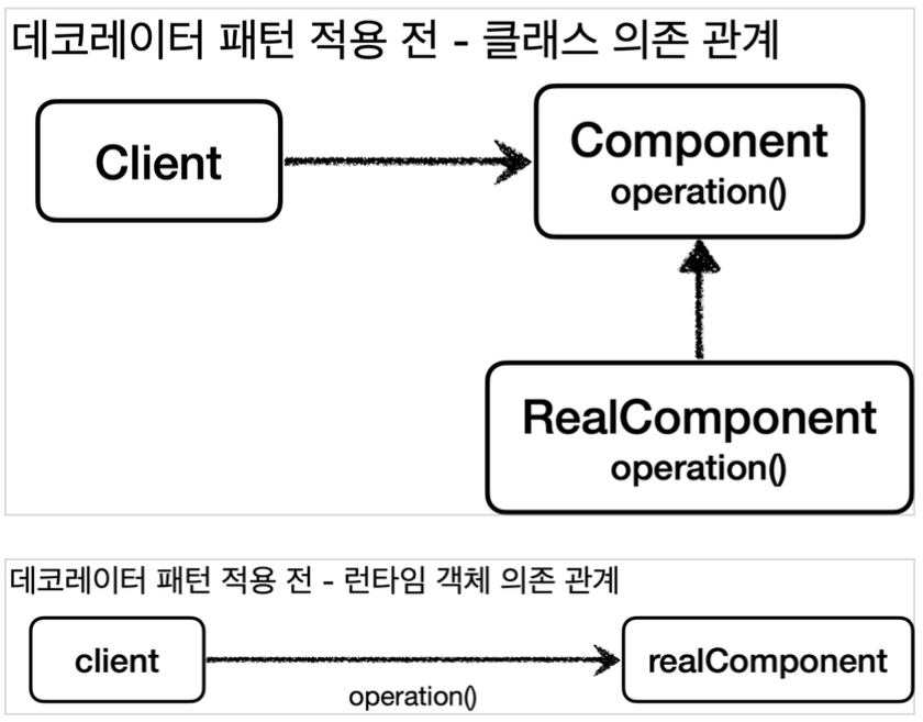 - client.execute 가 실행되면 MessageDecorator.operation()이 실행되며, MessageDecorator.operation() 내부에서 부가기능을 수행하고 realComponent.operation()을 실행하게 된다.