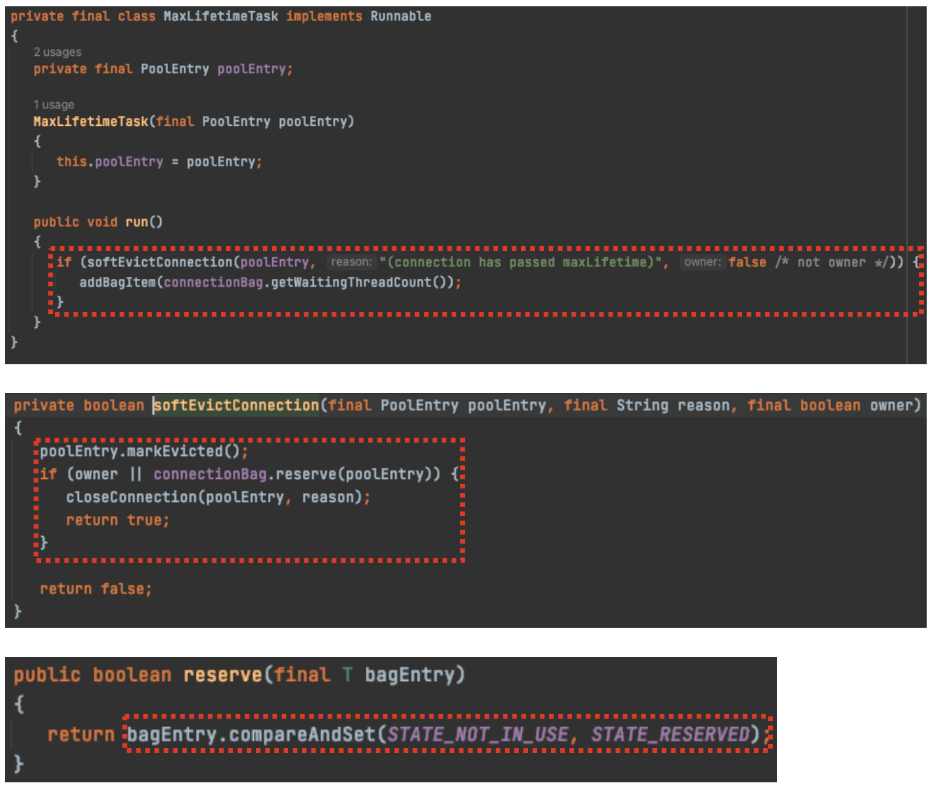 new MaxLifetimeTask(poolEntry)를 통해서 삭제하라는 task를 만들어 houseKeepingExecutorService에게 전달한다. - 해당 MaxLifetimeTask.run() 메소드를 보면 softEvictConnection() 를 통해서 커넥션이 삭제됐는지 체크하고 삭제된 경우 addBagItem() 메소드를 통해서 새로 커넥션을 생성한다.