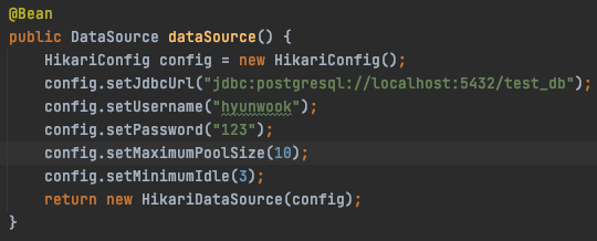 - 이런 경우에 위와 같은 설정으로 개발을 해도 나쁘진 않을 것 같다는 생각이 들었다. 하지만, 운영환경에서는 maximumPoolSize를 10으로 두고 minimumIdle는 설정하지 않는 것을 권장한다. 이유는 당연히 DB로 부터 커넥션을 맺어서 Pool에 추가하는 비용이 크기 때문이다.