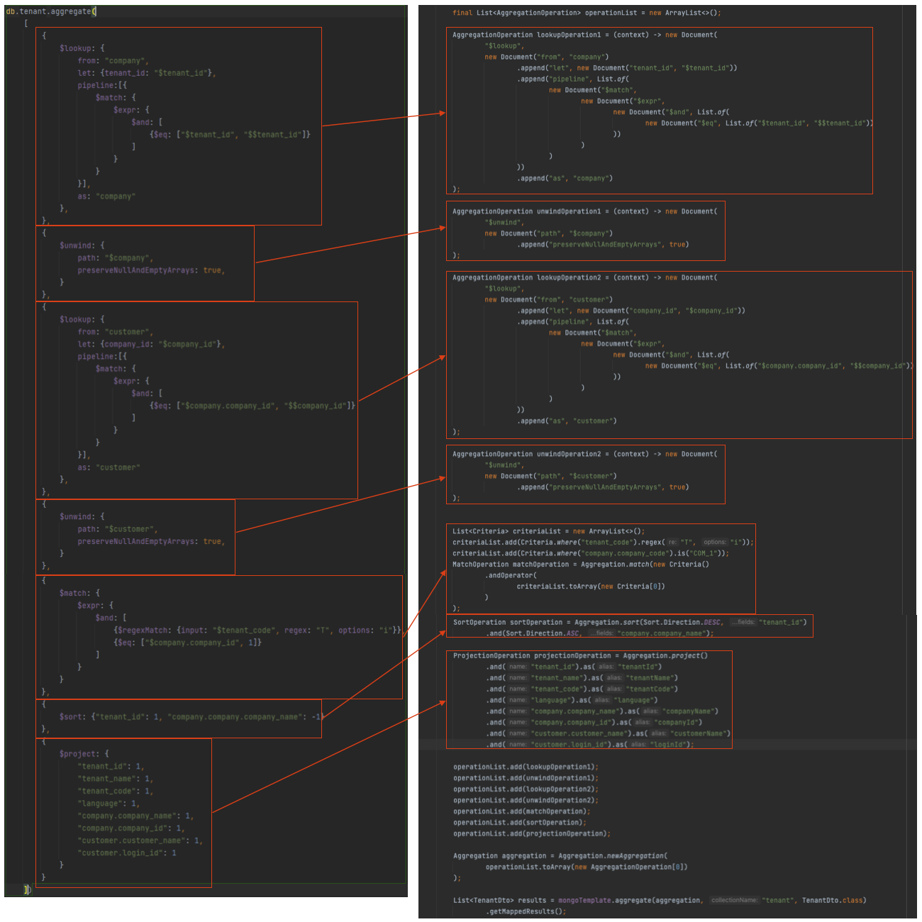 - 2편에서 언급한 대로 MongoDB Aggregation을 Java 코드로 구현하면 위와 같이 복잡하고, 실수할 여지가 많다.