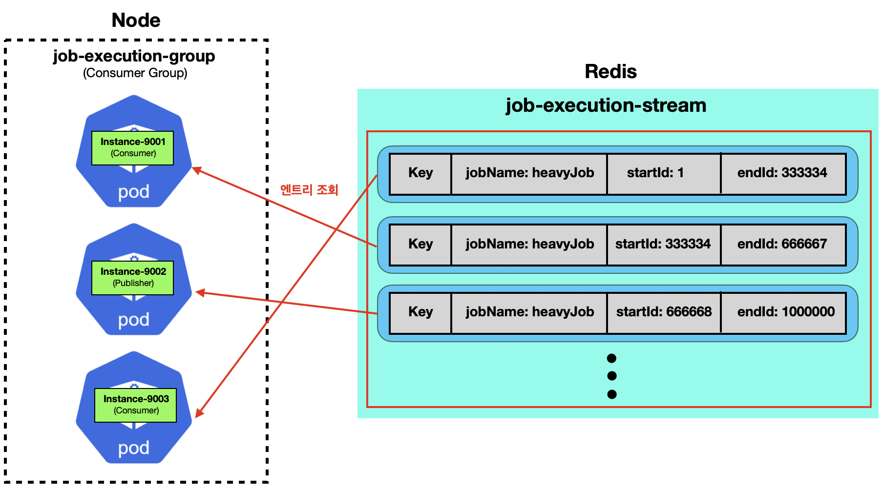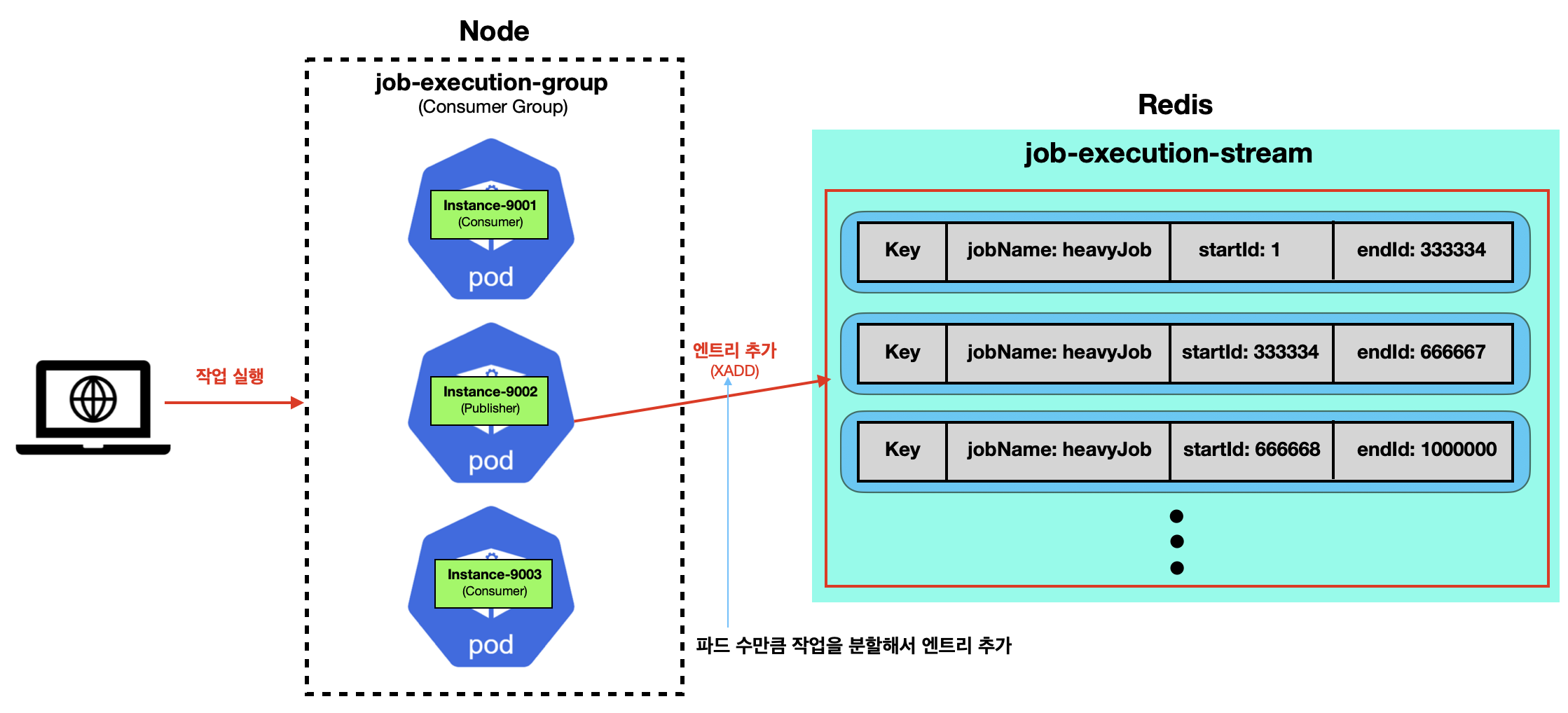 - 그 뒤에 해당 작업을 파드 수만큼 분할해서 Redis Streams에 엔트리를 추가한다.
