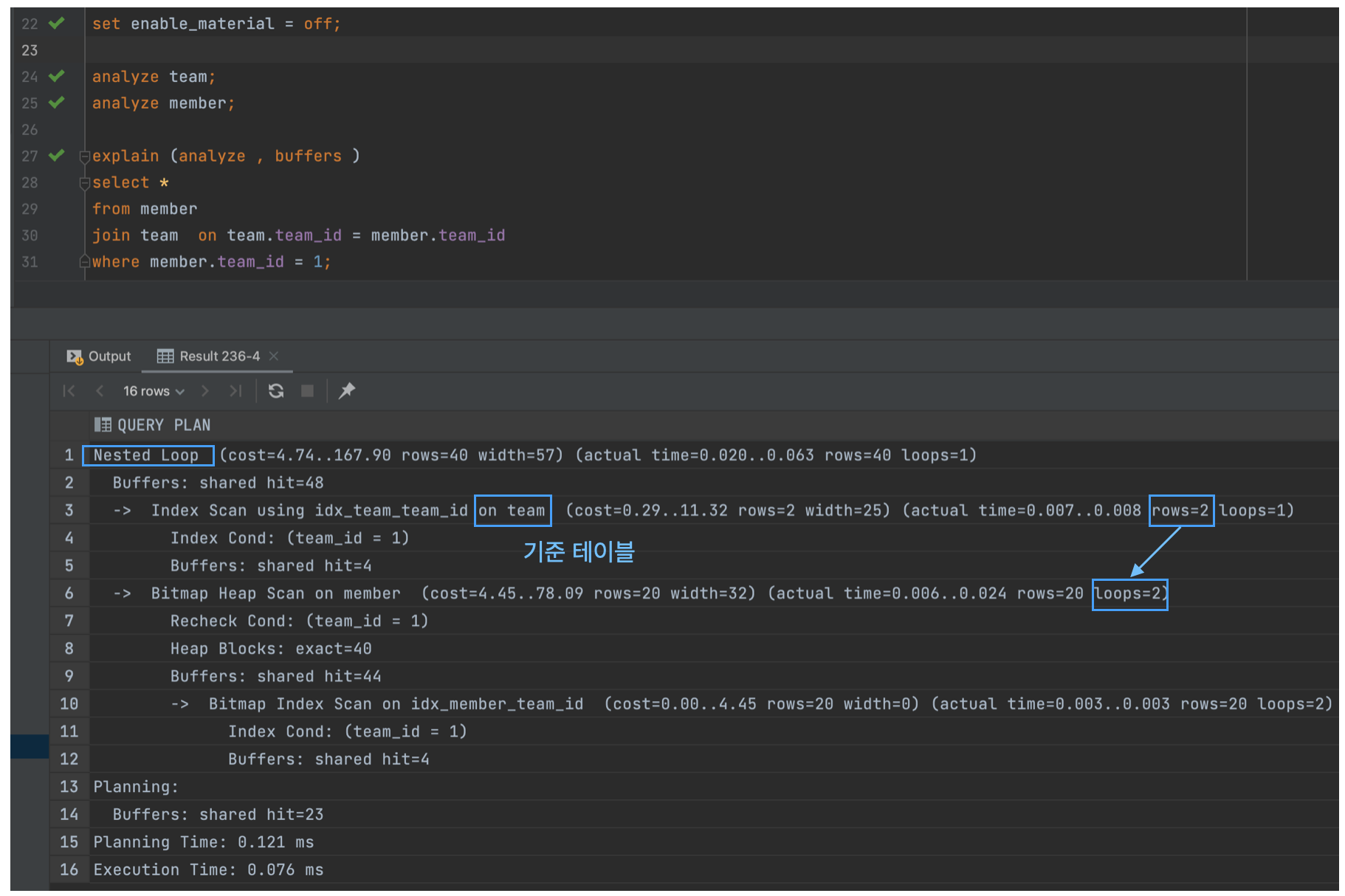 SET enable_material = OFF를 설정했다. - 위 실행계획에서 볼 수 있듯이, NL Join의 경우에 team, member 중에서 크기가 작은 team을 기준테이블로 선정한 것을 확인할 수 있다.