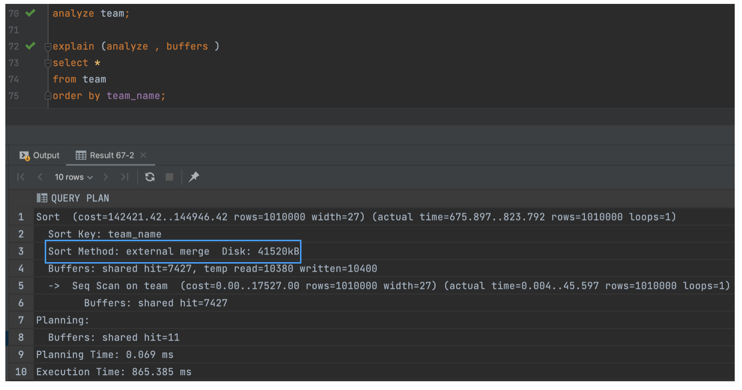 work_mem설정 내에서 수행될 수 있다면,빠른 퀵소트(quicksort)알고리즘이 사용됩니다. - 정렬이