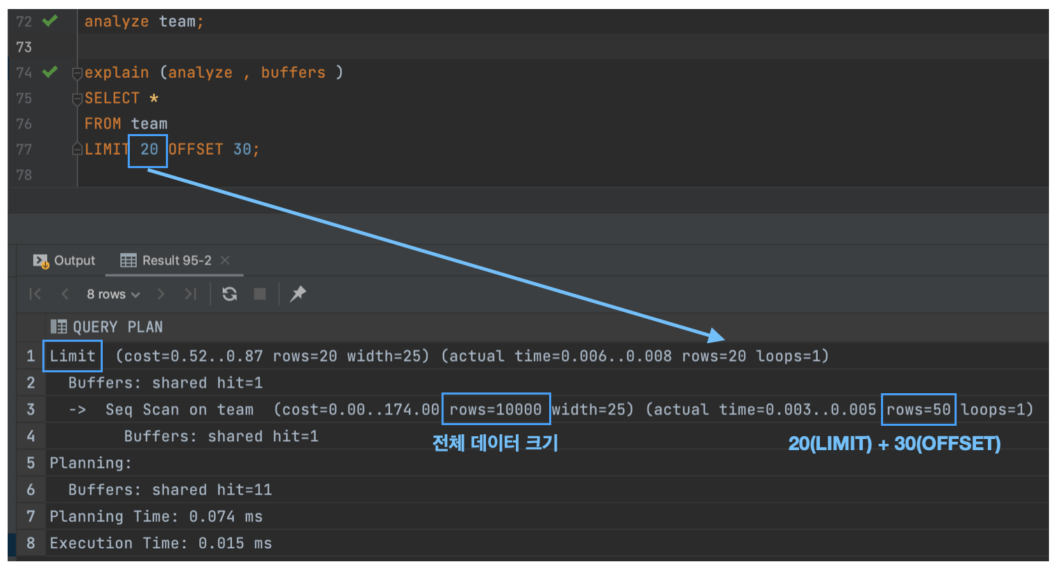 (actual time=0.003..0.005 rows=50 loops=1)이 부분이다.- 나는 처음에 rows가 20일 거라 생각했다. 그 이유는 31번째부터 50번째만 읽어올 거라 생각했다.