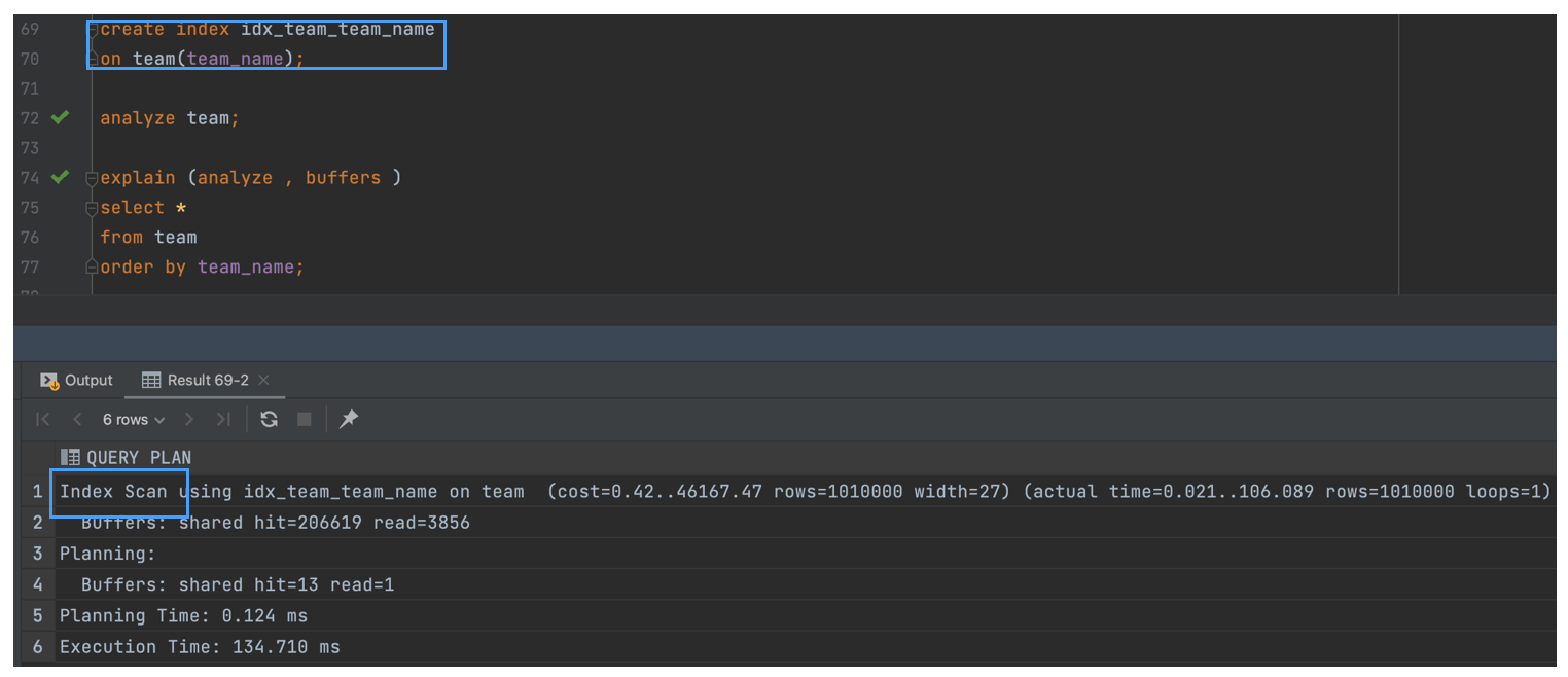 - 위에서 볼 수 있듯이, 인덱스를 사용하면 Sort 연산을 대신처리할 수 있고, 데이터가 많은 경우 훨씬 좋은 성능을 볼 수 있다.