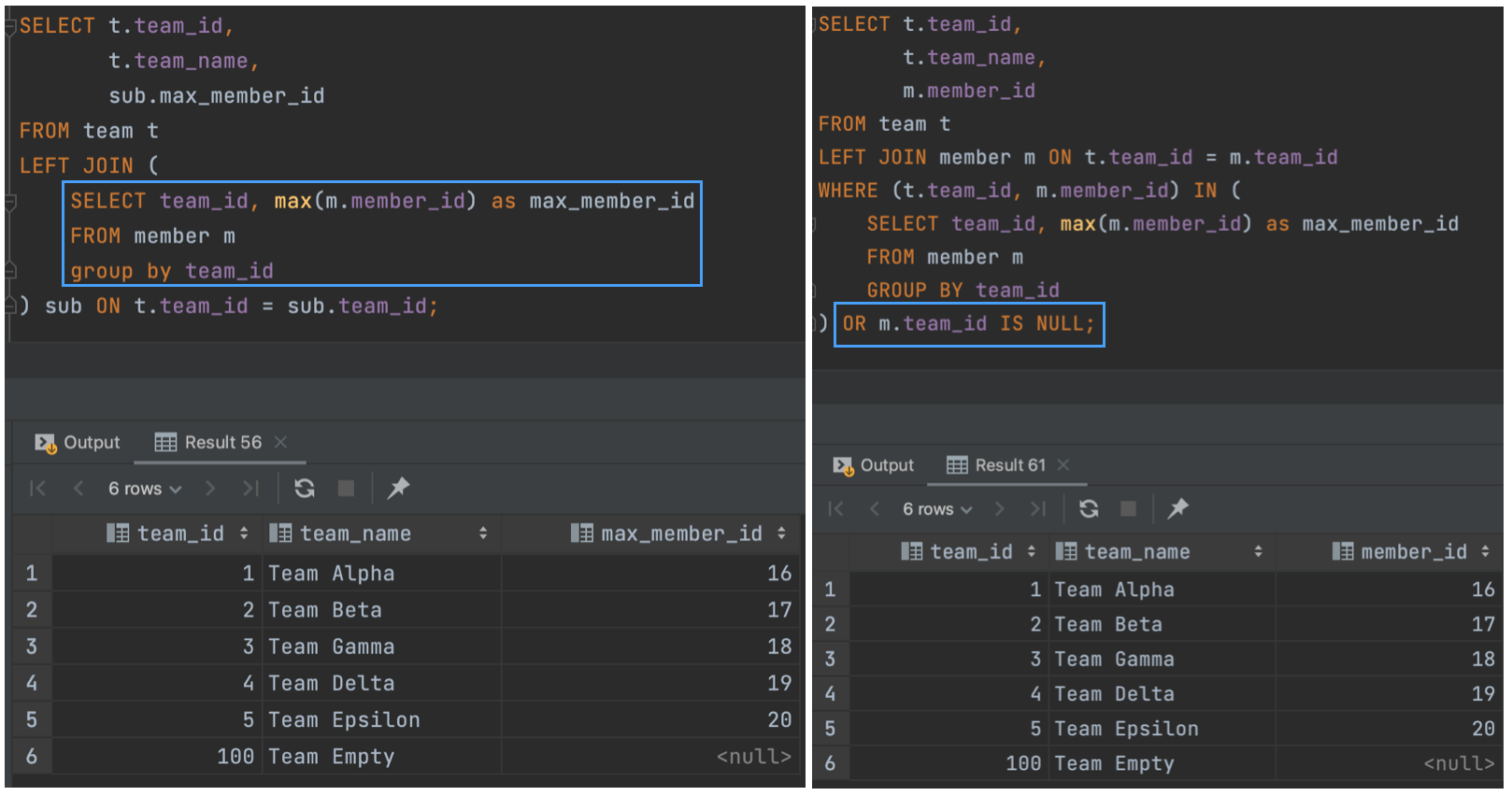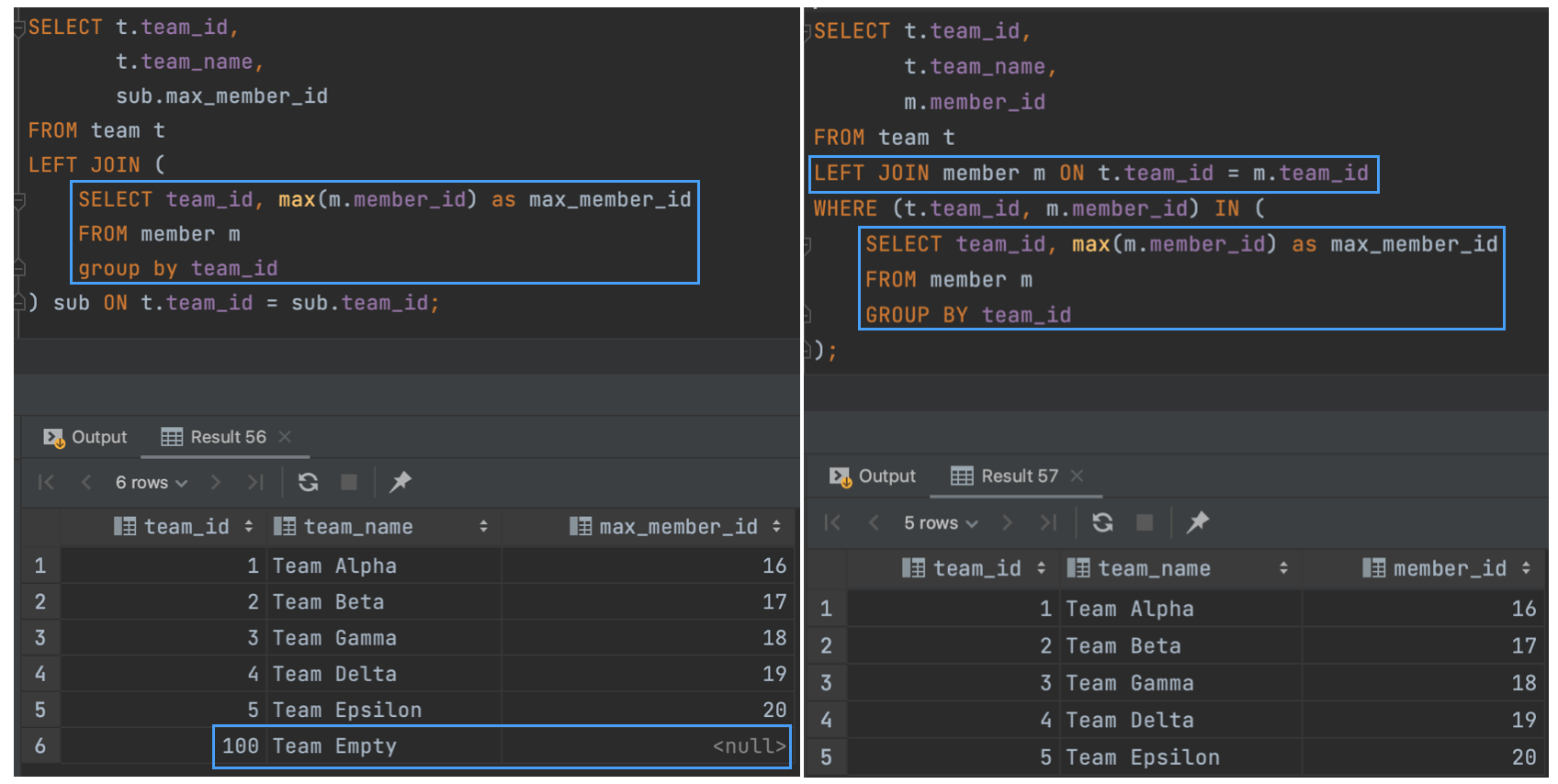 team_id(100)인 team 데이터가 빠져있다.Where절에서 IN으로 필터링했기 때문에 당연하게도 서브쿼리에 포함되어있지 않은 데이터는 사라지게 된다. - 위 문제를 해결하기 위해서는 아래와 같은