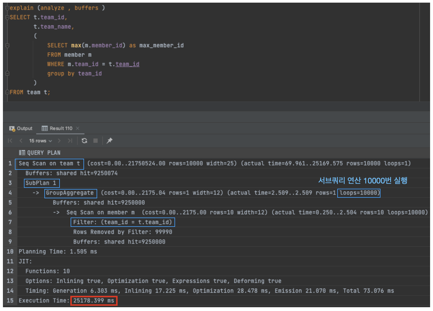 - 여기서 주목할 점은 SubPlan의 실행 횟수인데, 충격적이게도