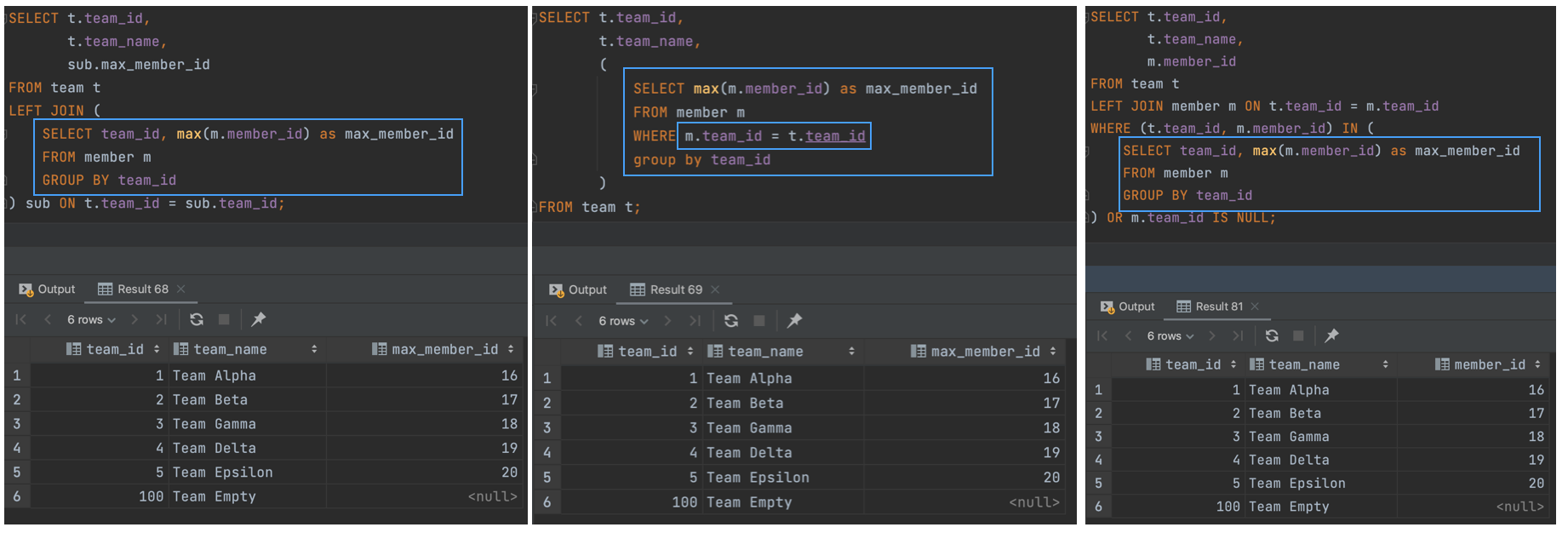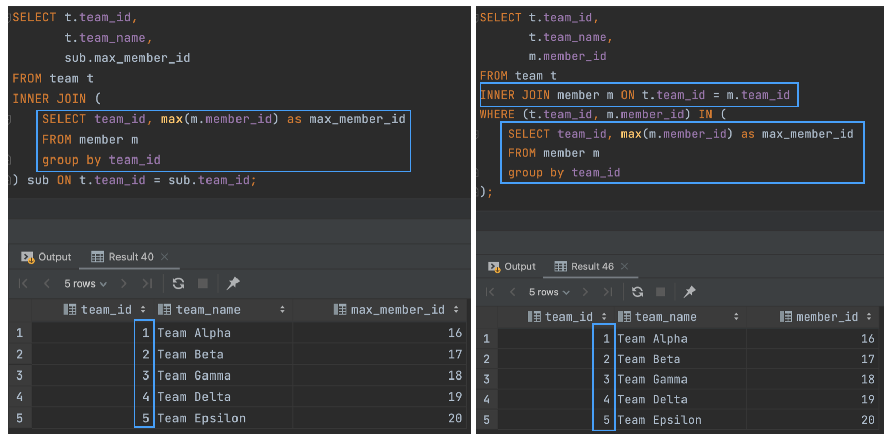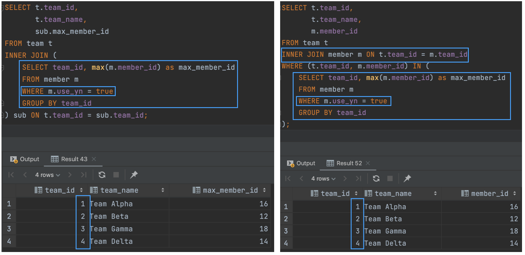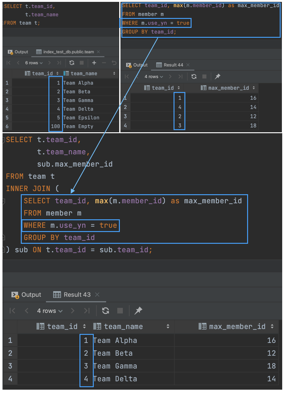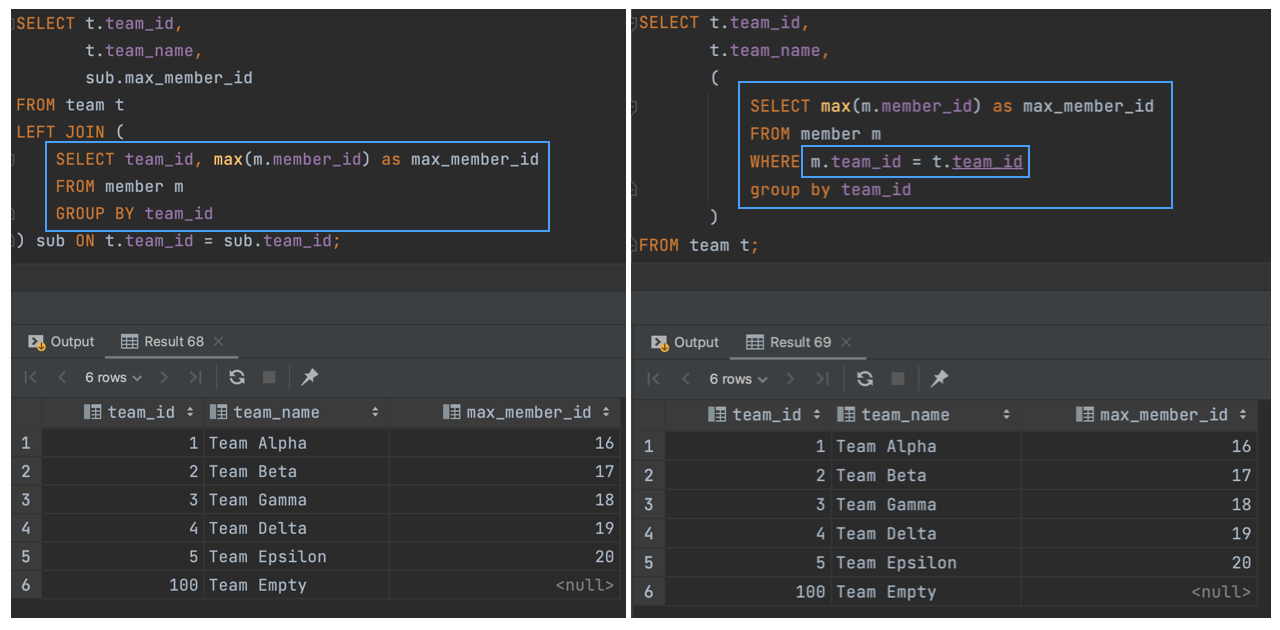 정리해 보면, INNER JOIN에서는 From절의 서브쿼리를 Where절로 바꿔도 쿼리의 결과는 같다. (성능적으로는 Where절의 서브쿼리가 더 안 좋을 가능성이 높다.)