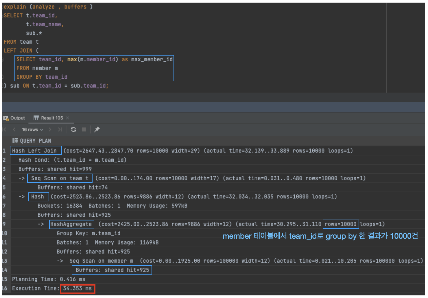 - 또한, Hash 테이블을 만드는 과정에서 HashAggregate 연산이 이루어졌고, group by 결과가 10000건인 것을 확인할 수 있다.