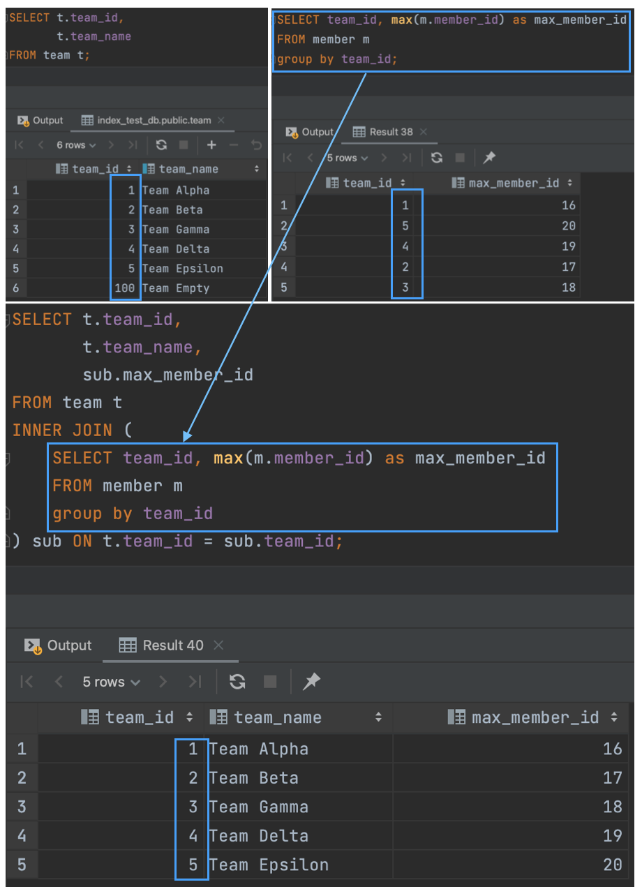 - 위와 같이 Group By절을 포함한 서브쿼리와 inner join 예시를 들어보자.