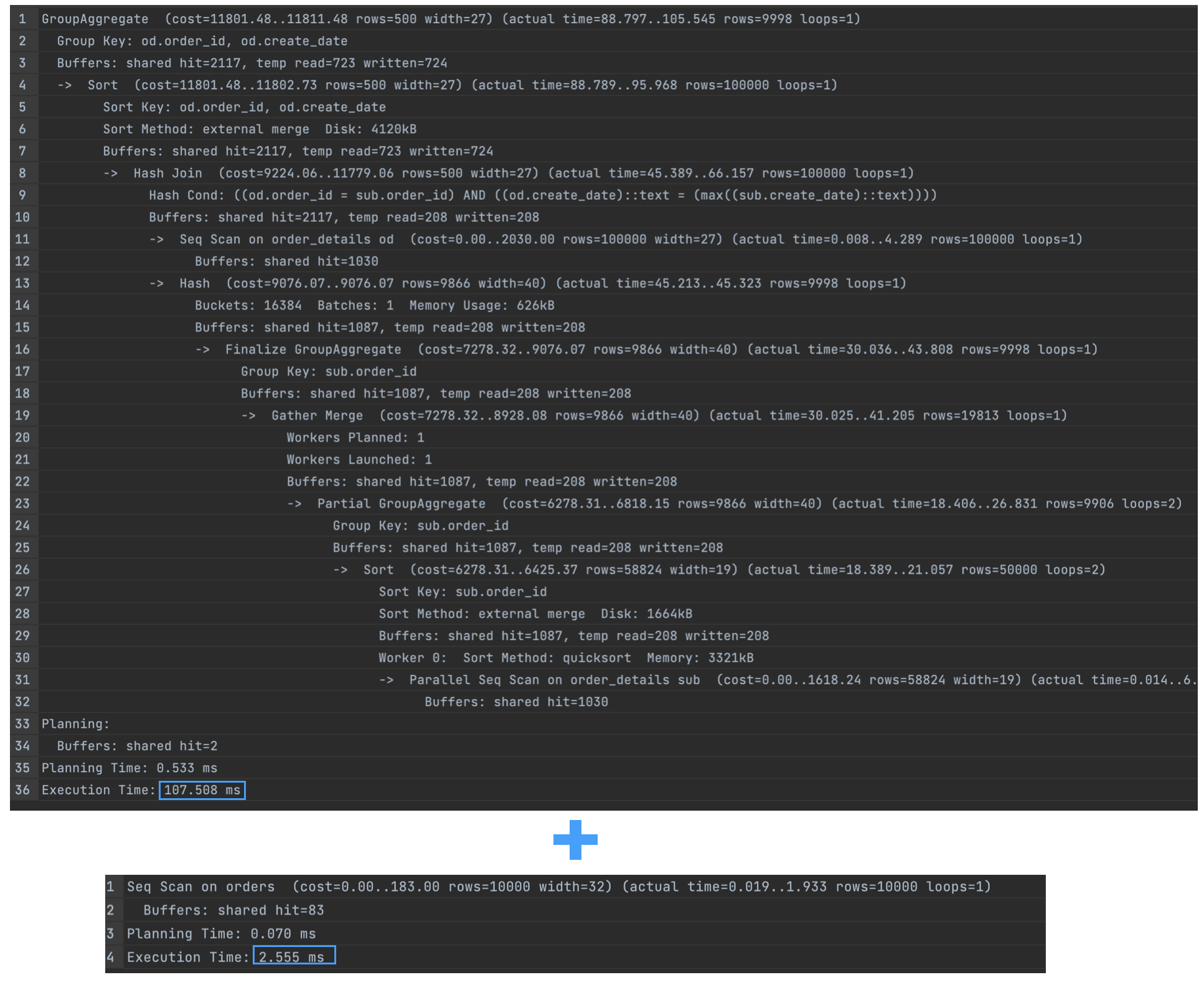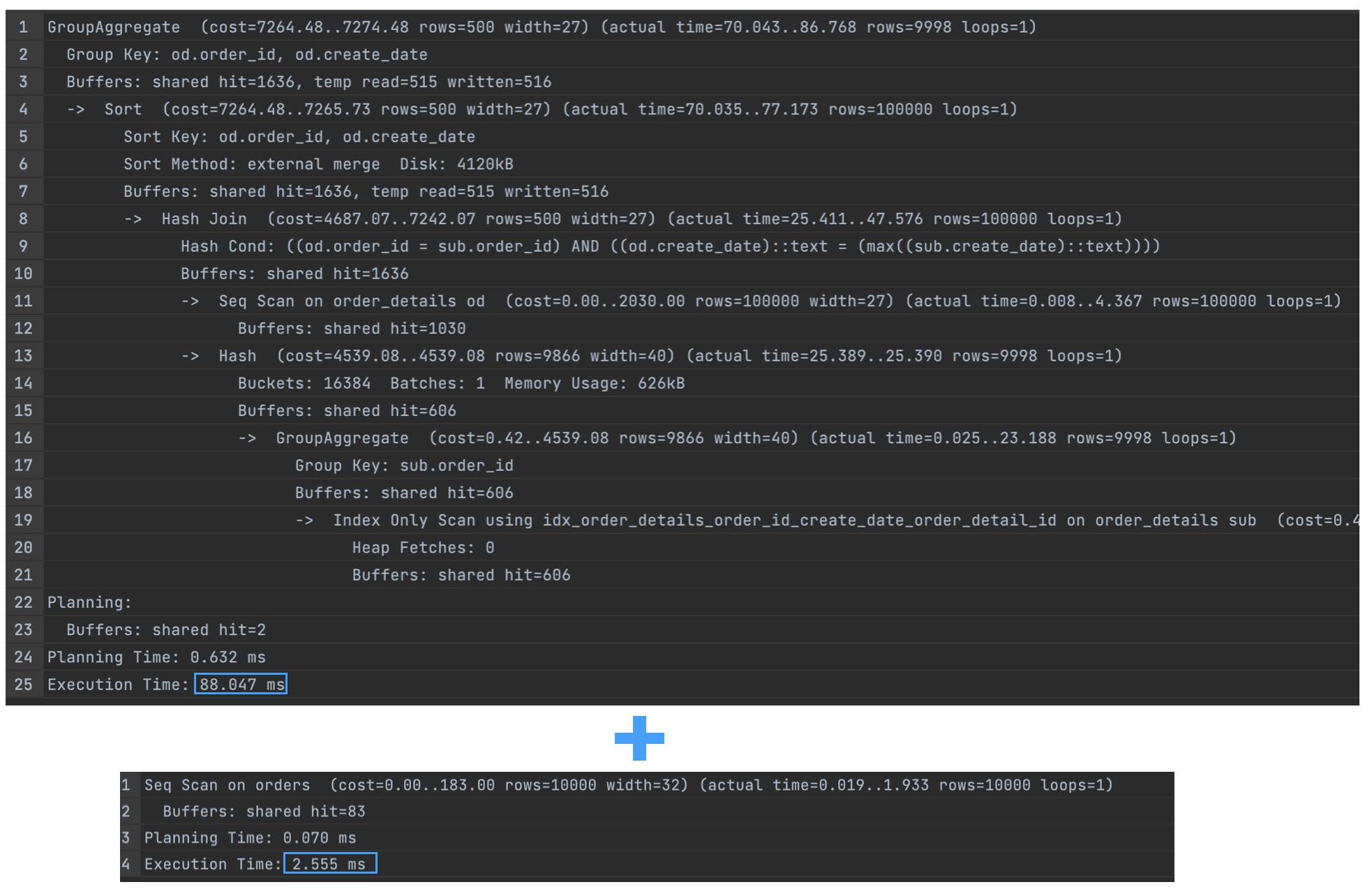 - 2개의 쿼리로 분리한 경우 1분 23초가 걸렸다.