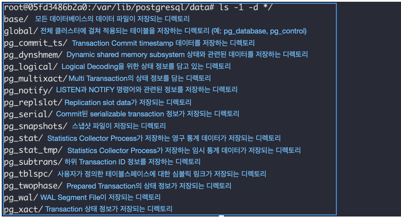 - 데이터베이스는 $PGDATA/base 디렉토리에 저장되어 있다.