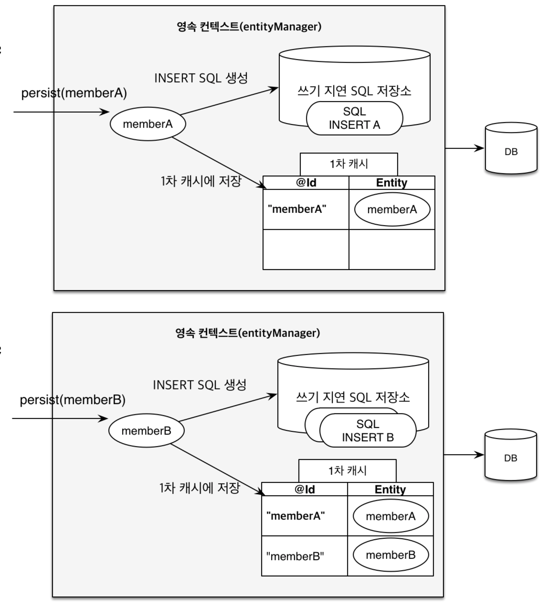 - 위와 같이 만약 memberA가 생성 됐다고 했을때, 먼저 1차 캐시에 생성되고, 동시에 insert 쿼리를 생성하고 쓰기지연 SQL 저장소에 저장한다.