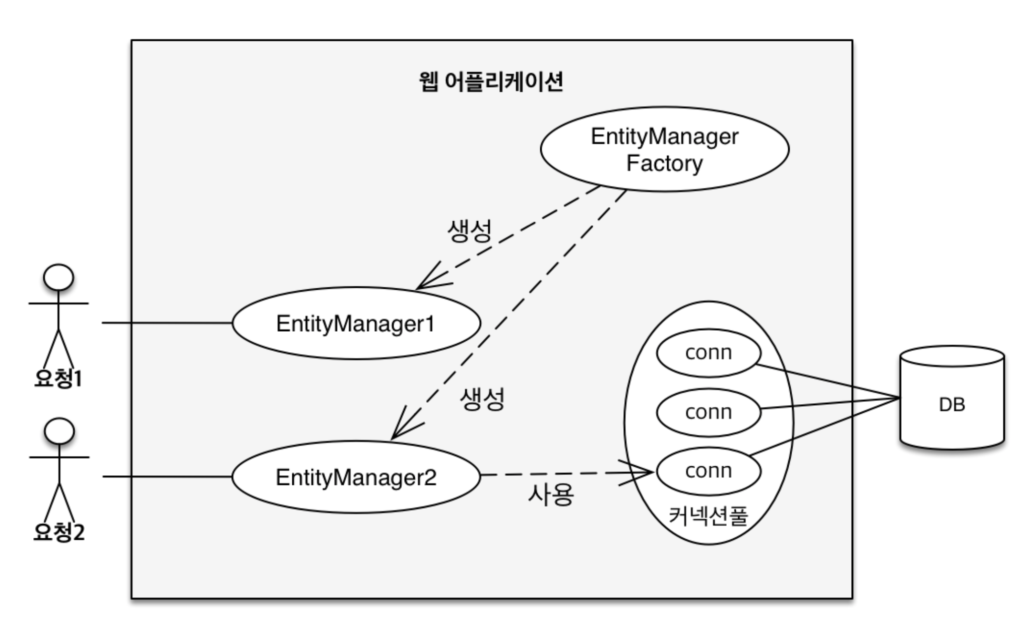 - 위와 같이 고객이 요청으하면 entityManagerFactory가 entityManager를 생성한다.
